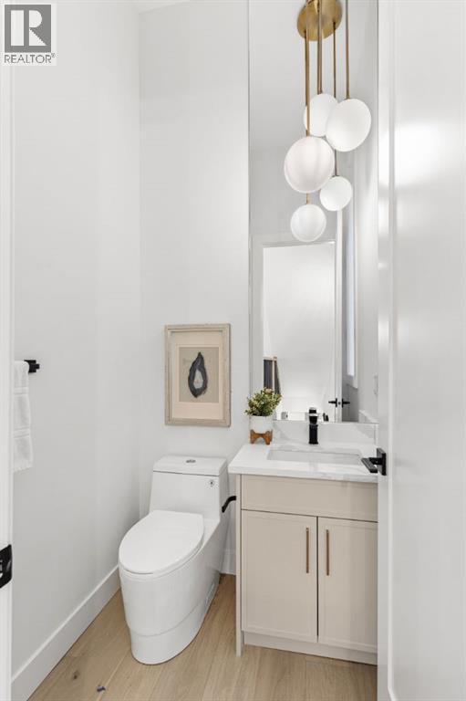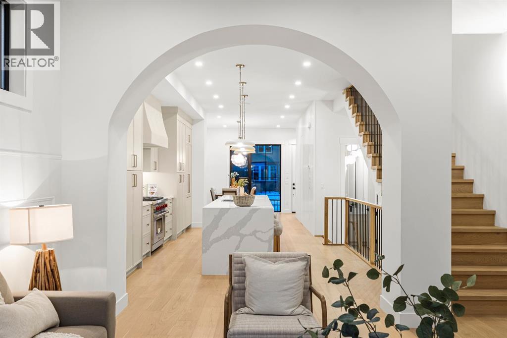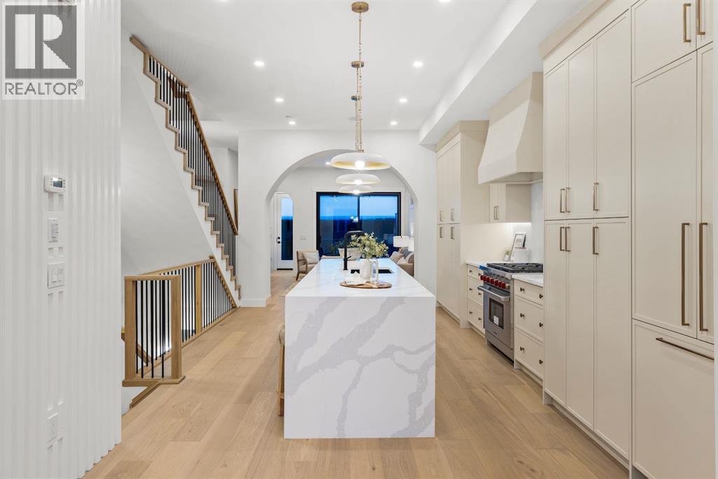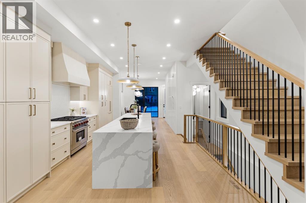 This extraordinary brick-exterior home is set in one of the most desirable locations and built by Jerry Homes with a thoughtfully designed, functional floor plan. A spacious foyer welcomes you into the main level with soaring 10-foot ceilings, a dining area accented with custom wainscoting, and a stunning kitchen featuring a massive 12-foot island, hidden walk-in pantry, high-end built-in Wolf and Dacor appliances, quartz countertops with under-cabinet lighting, and elegant gold accents. A beautifully crafted archway separates the kitchen from the great room, anchored by a custom multi-tier gas fireplace, while the mudroom provides ample storage. Large windows throughout the home fill every level with natural light, enhancing the open and airy design. Upstairs, 9-foot ceilings frame a lavish primary suite with two large walk-in closets and a spa-inspired 5-piece ensuite fully wrapped in designer tile, complete with steam shower rough-in, in-floor heating, and a soaking tub. Two additional bedrooms, a 3-piece bath, and a full laundry room complete the upper level. The fully developed basement includes in-floor heating rough-in, a spacious rec room, wet bar, fourth bedroom, and a 3-piece bath. Additional features include rough-ins for A/C, built-in ceiling speakers, an alarm system, and exterior cameras. Ideally located near top schools, parks, and the shops and restaurants of Marda Loop, this home blends quiet luxury with unmatched convenience. Call today to book your tour! (id:51913)