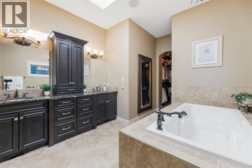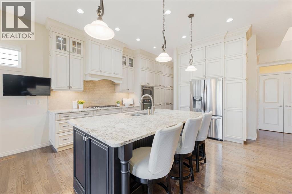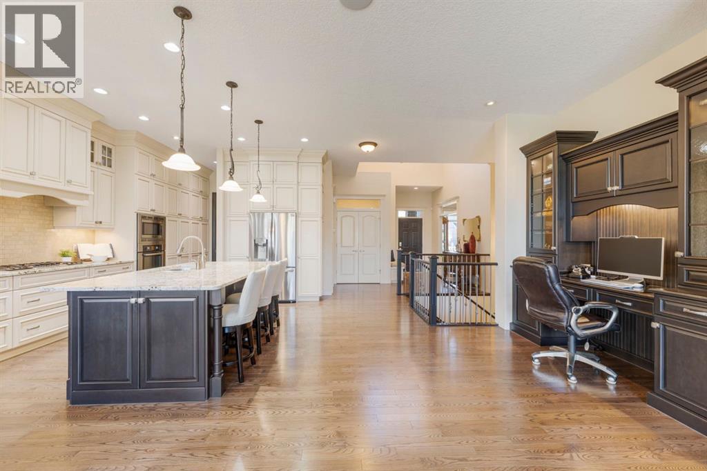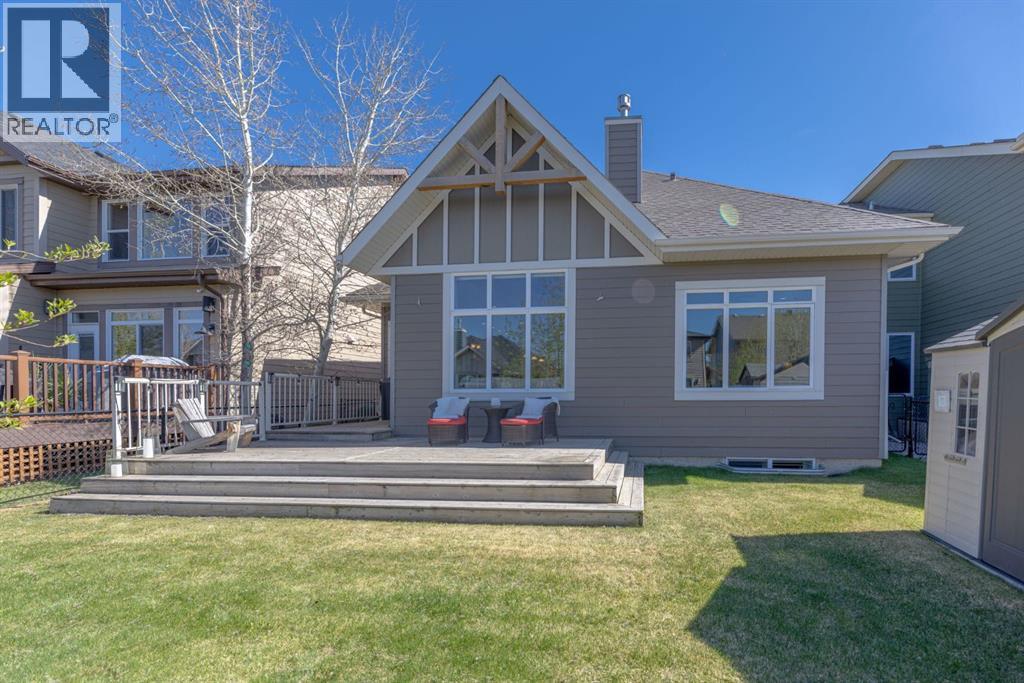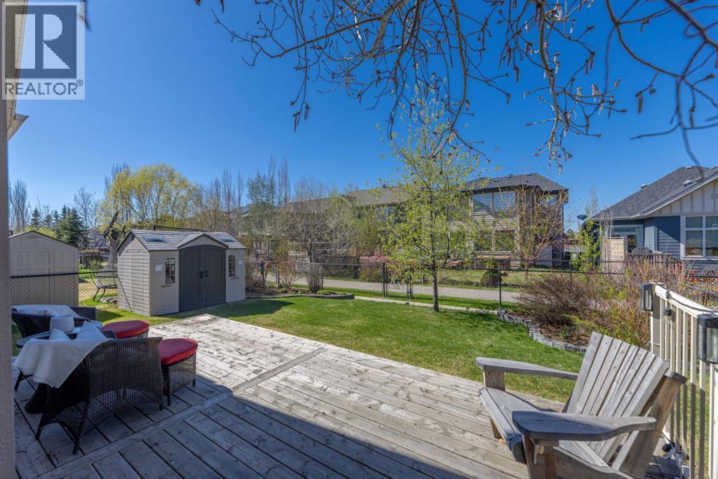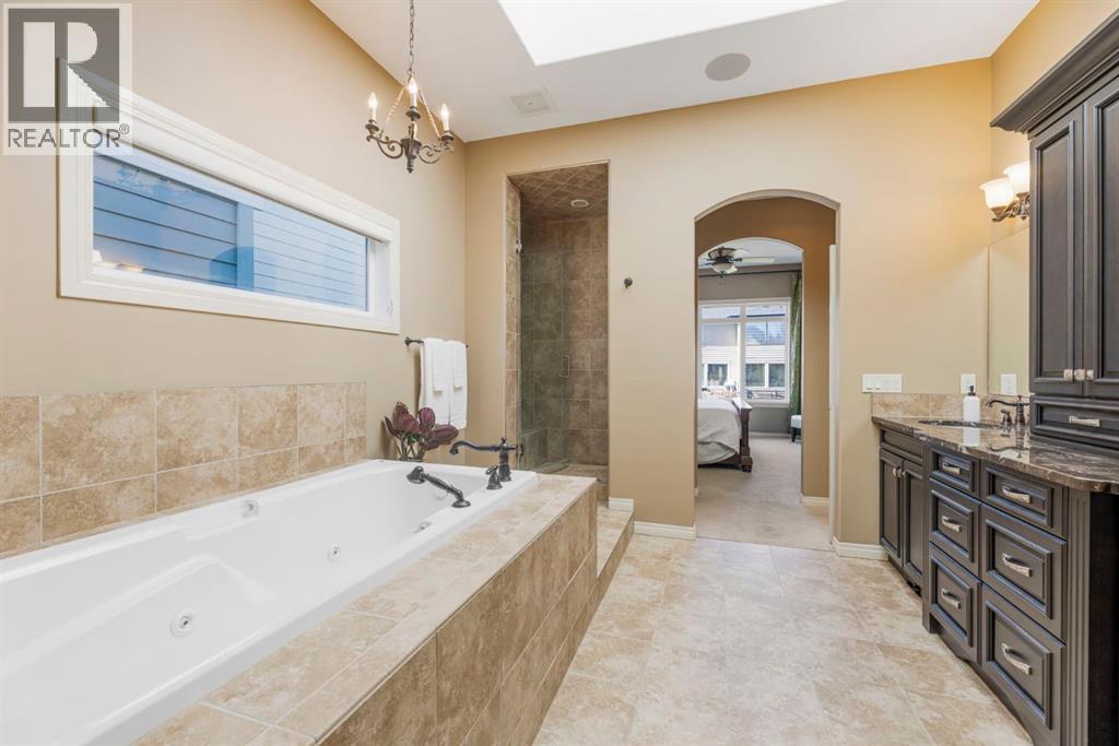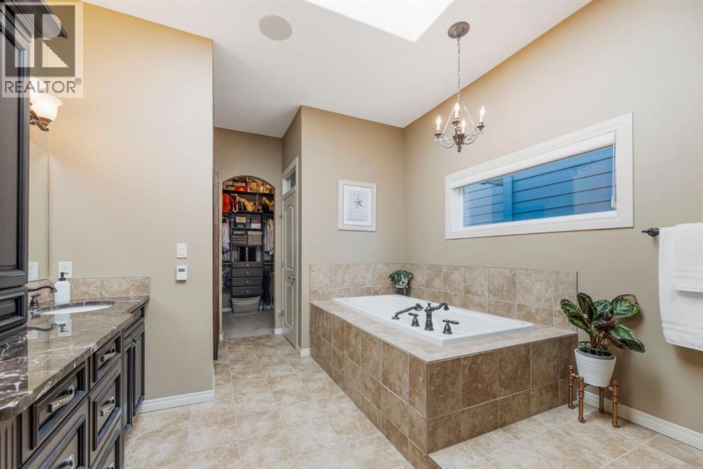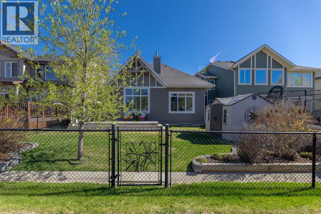 Welcome to this Albi-built, custom-crafted bungalow in the heart of one of Calgary’s most desirable lake communities. Just nine homes from the shared dock, this residence offers a perfect blend of luxury, comfort, and rare lake access. From the moment you arrive, the curb appeal makes a statement—stained solid wood garage doors, full-height brick columns, and pristine landscaping set the tone for what’s inside. Step into a warm foyer that opens to a bright, open-concept layout featuring soaring 10-foot ceilings, transom windows, and rich hardwood floors throughout the main level. The gourmet kitchen is designed to impress, with ceiling-height cabinetry, granite countertops, a central island with spice cabinets at both ends, built-in wall oven and microwave with warming drawer, and a walk-through pantry for everyday convenience. The adjacent living room offers a cozy gas fireplace framed with custom millwork and expansive windows that fill the home with natural light while showcasing views of the backyard. A formal dining room provides an elegant space for entertaining, while the built-in home office is both stylish and functional. The spacious primary suite is a true retreat, complete with a spa-inspired ensuite featuring heated tile floors, a jetted tub, walk-in shower, dual vanities, and skylight. The walk-in closet even has its own window for natural light. The fully finished basement expands your living space with 9-foot ceilings, a large recreation room, two additional bedrooms, office space, and a full bathroom—ideal for family or guests. Outdoors, your sunny backyard oasis awaits with a spacious deck overlooking the greenbelt and walking path. Whether hosting or relaxing, it’s the perfect extension of your living space. And with the lake just steps away, every day feels like a vacation.Additional highlights include central air conditioning, toe-kick vacuums in the kitchen and ensuite, oversized windows, and the welcoming sense of community this neighbourhood is known for. This isn’t just a home it’s a lifestyle. (id:51913)