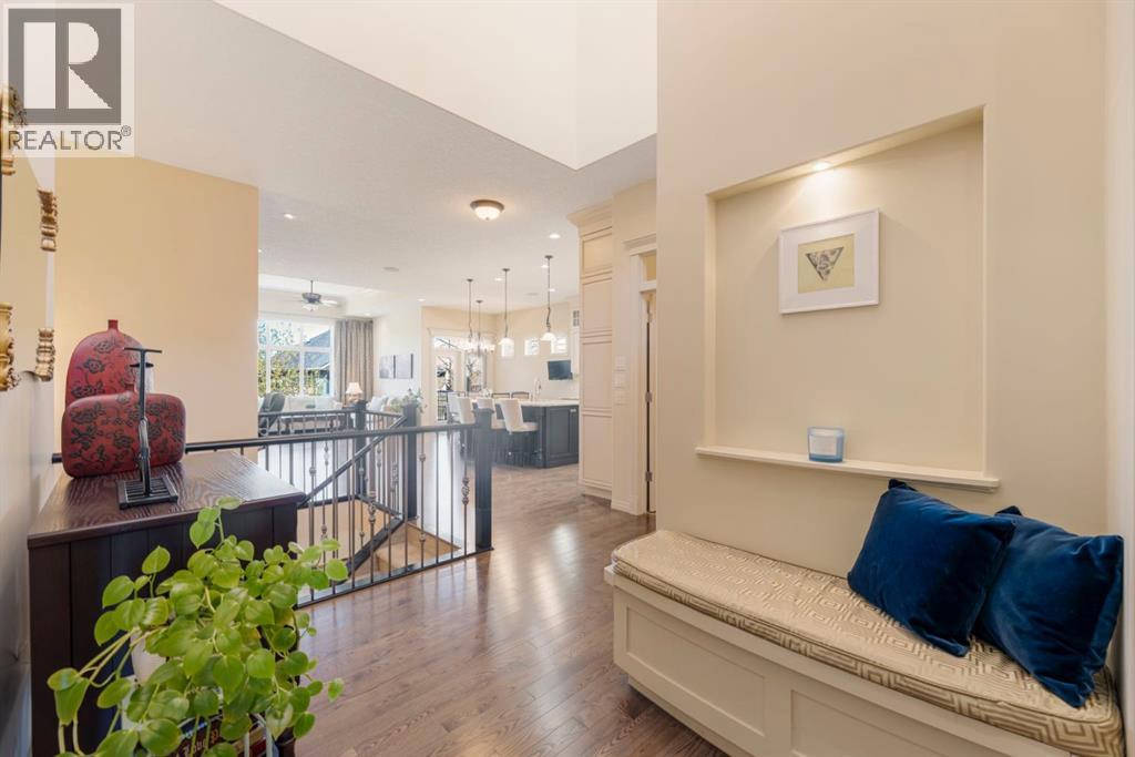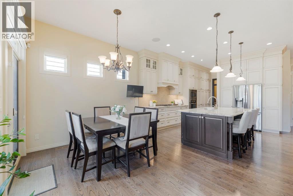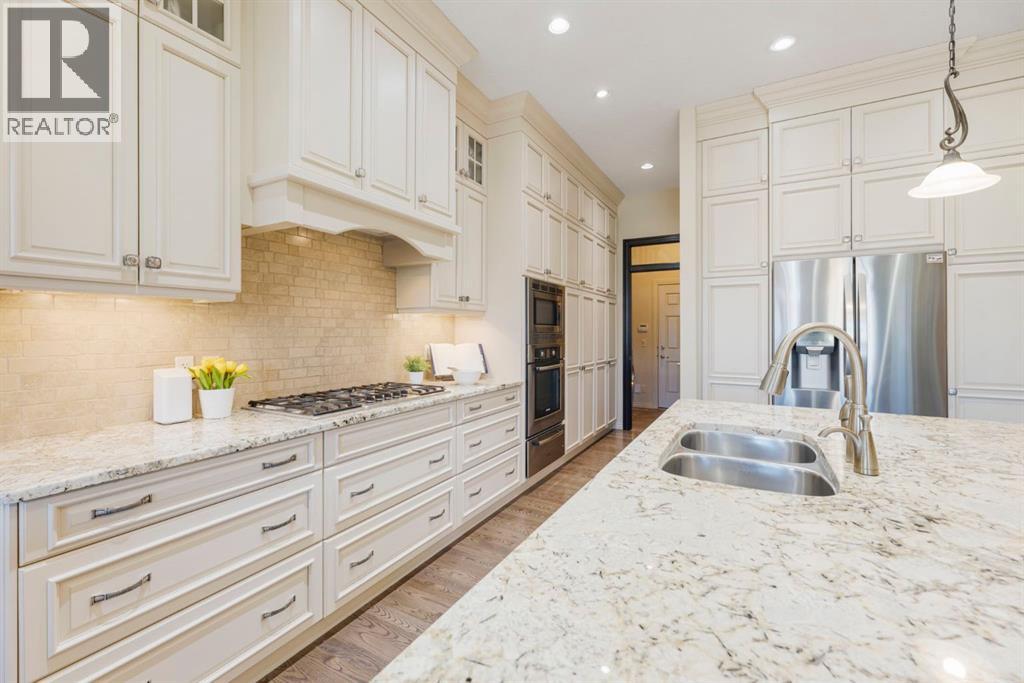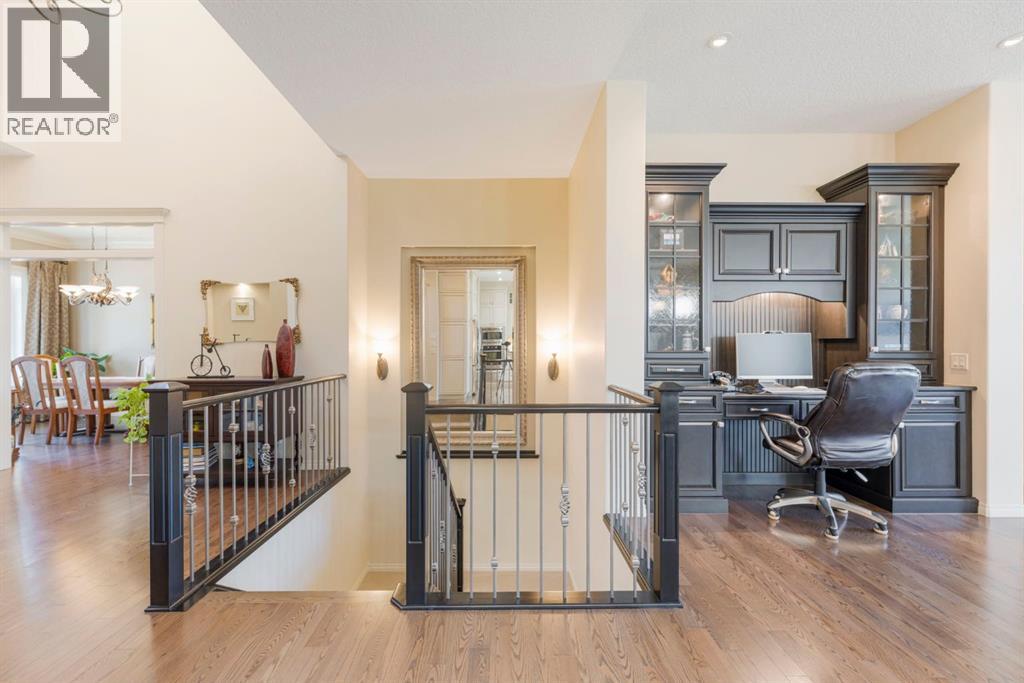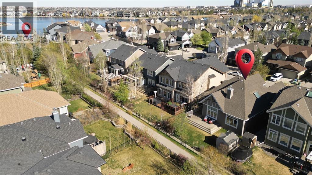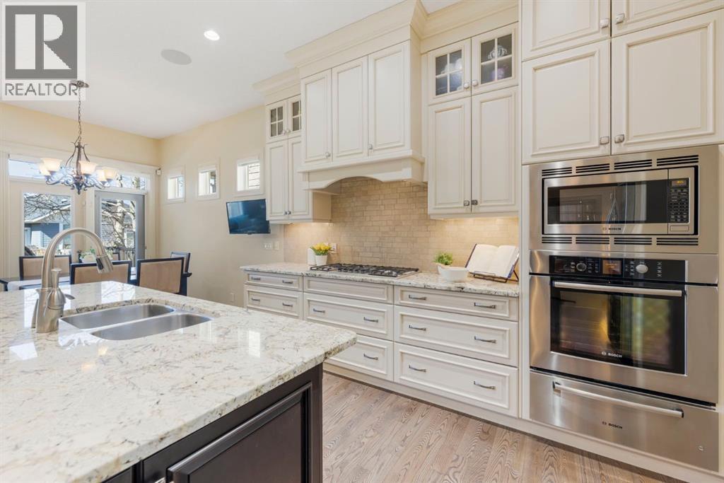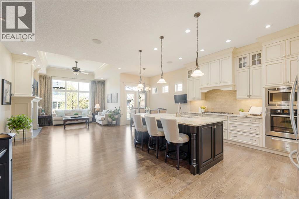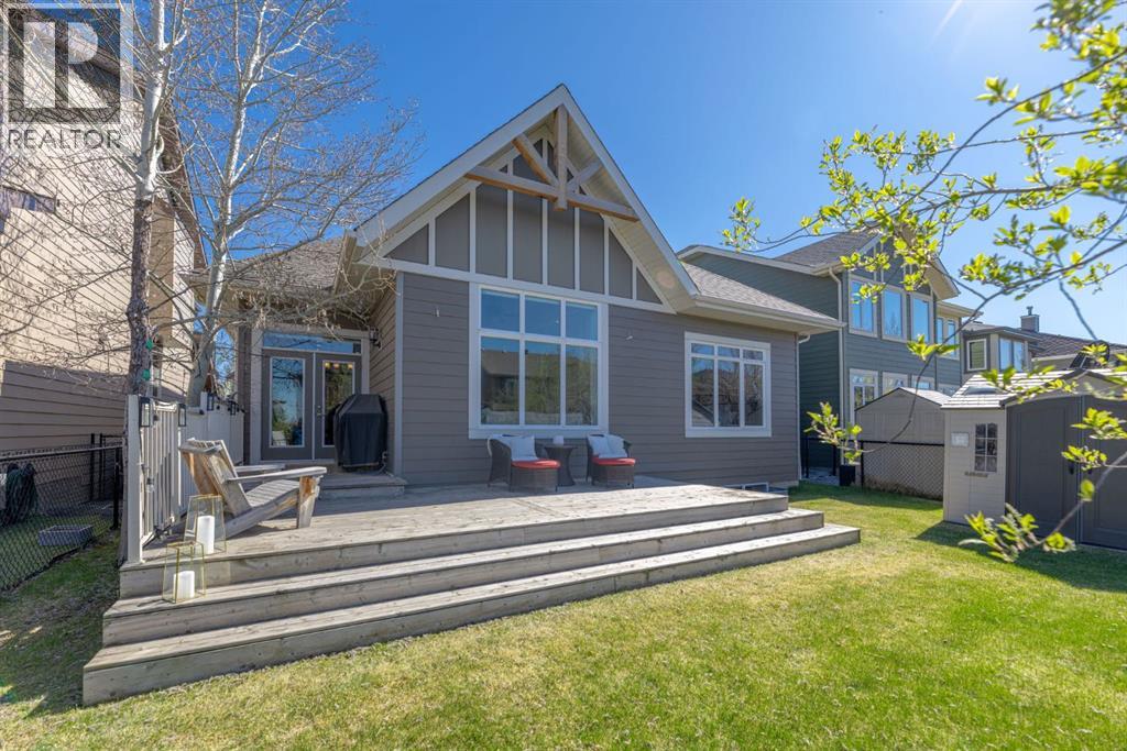Welcome to this Albi-built, custom-crafted bungalow in the heart of one of Calgary’s most desirable lake communities. Just nine homes from the shared dock, this residence offers a perfect blend of luxury, comfort, and rare lake access. From the moment you arrive, the curb appeal makes a statement—stained solid wood garage doors, full-height brick columns, and pristine landscaping set the tone for what’s inside. Step into a warm foyer that opens to a bright, open-concept layout featuring soaring 10-foot ceilings, transom windows, and rich hardwood floors throughout the main level. The gourmet kitchen is designed to impress, with ceiling-height cabinetry, granite countertops, a central island with spice cabinets at both ends, built-in wall oven and microwave with warming drawer, and a walk-through pantry for everyday convenience. The adjacent living room offers a cozy gas fireplace framed with custom millwork and expansive windows that fill the home with natural light while showcasing views of the backyard. A formal dining room provides an elegant space for entertaining, while the built-in home office is both stylish and functional. The spacious primary suite is a true retreat, complete with a spa-inspired ensuite featuring heated tile floors, a jetted tub, walk-in shower, dual vanities, and skylight. The walk-in closet even has its own window for natural light. The fully finished basement expands your living space with 9-foot ceilings, a large recreation room, two additional bedrooms, office space, and a full bathroom—ideal for family or guests. Outdoors, your sunny backyard oasis awaits with a spacious deck overlooking the greenbelt and walking path. Whether hosting or relaxing, it’s the perfect extension of your living space. And with the lake just steps away, every day feels like a vacation.Additional highlights include central air conditioning, toe-kick vacuums in the kitchen and ensuite, oversized windows, and the welcoming sense of community this neighbourhood is known for. This isn’t just a home it’s a lifestyle. (id:51913)