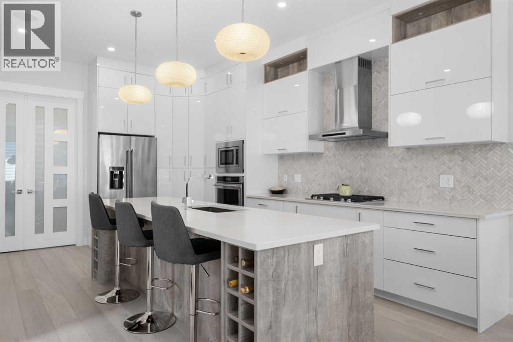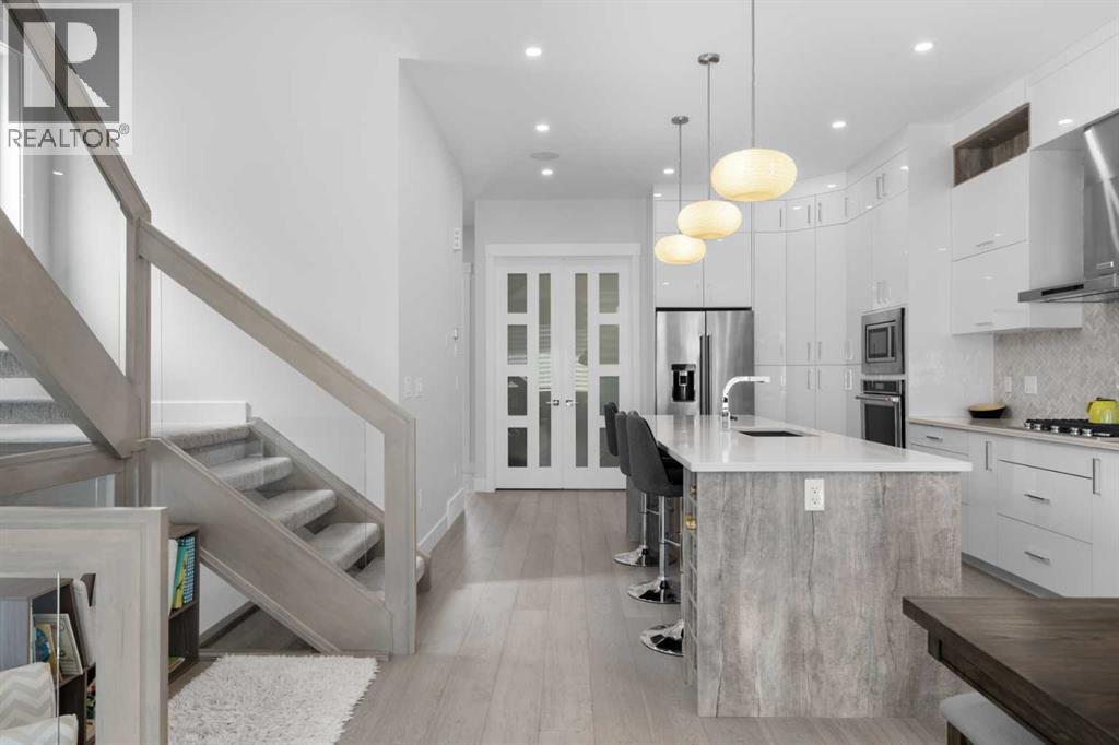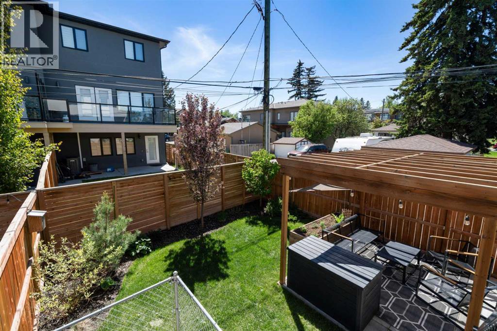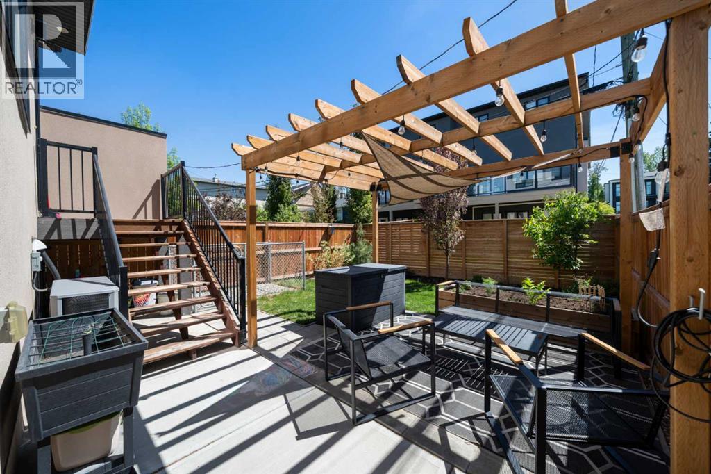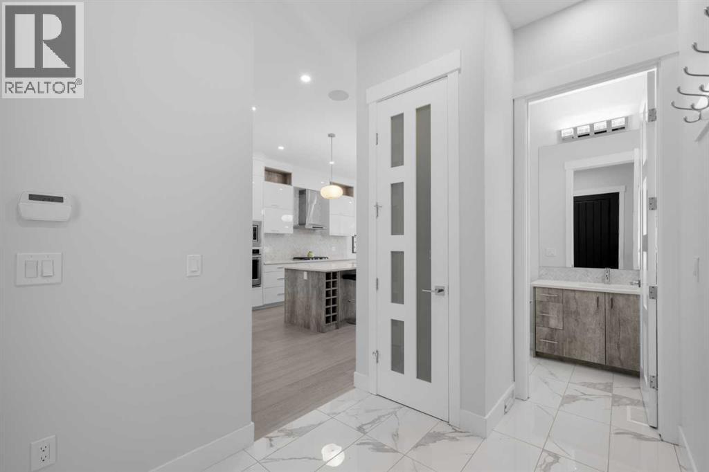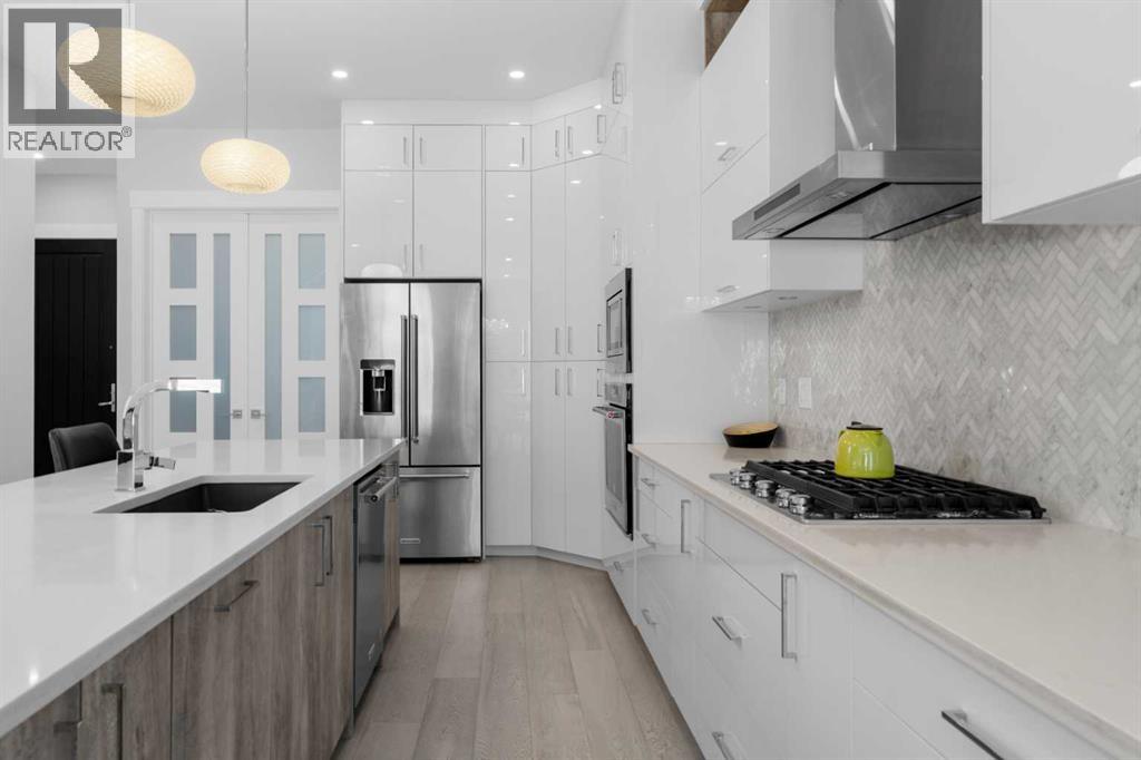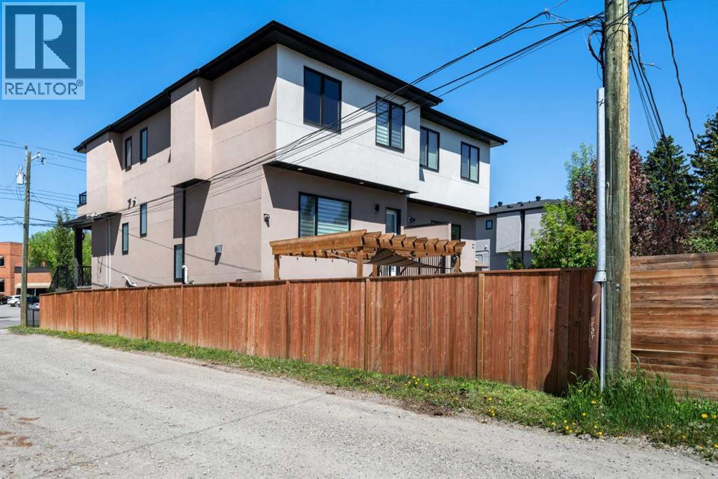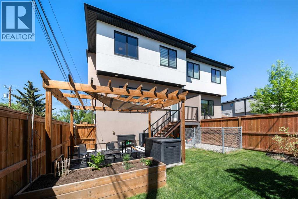 Discover modern living at its finest in this stunning two-storey semi-detached home, offering a rare under drive double attached garage and a stylish front veranda. Designed with exceptional attention to detail, this home boasts 4 bedrooms, 3.5 bathrooms, and air conditioning, ensuring year-round comfort. With heated floors in the primary ensuite, basement and even the garage giving you extra warmth. Step inside to a bright, open layout adorned with hardwood and tile flooring on the main level. The front office with French doors provides the perfect work-from-home space. The gourmet kitchen is a chef’s dream, featuring a large center island with quartz countertops, full-height high-gloss cabinets, a built-in stainless steel appliance package including a gas cooktop stove and chimney hood fan. Entertain effortlessly in the central dining room and rear living room, complete with a center gas fireplace with tile surround and built-ins, with seamless access to the backyard.Upstairs, retreat to the luxurious primary suite, boasting a private balcony with captivating city views. The spa-like 5-piece ensuite includes a dual vanity, a freestanding tub, and a custom glass shower, while the massive walk-in closet offers custom organizers and drawers. Two additional bedrooms, a 4-piece bathroom, and a convenient laundry room with a sink complete the upper level.The fully developed basement extends your living space with a cozy rec room, an additional bedroom, and a 4-piece bathroom—perfect for guests or family.The backyard is a true oasis, featuring an upper deck with stairs leading to a lower patio, a pergola, beautifully maintained gardens with a built-in planter, and a dedicated dog run.Situated on a corner lot next to an alley, this property shares only one attached neighbor and offers easy access to 17th Avenue and major roads, ensuring a quick commute in and out of the city. Make sure to click on the video tour icon! (id:51913)