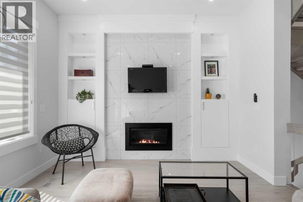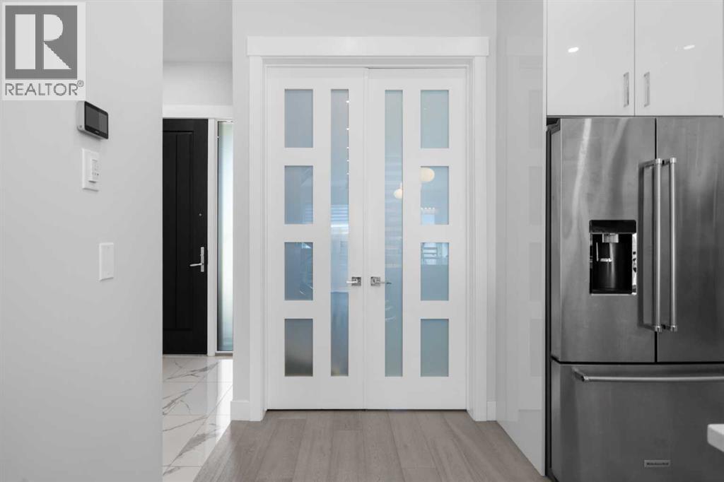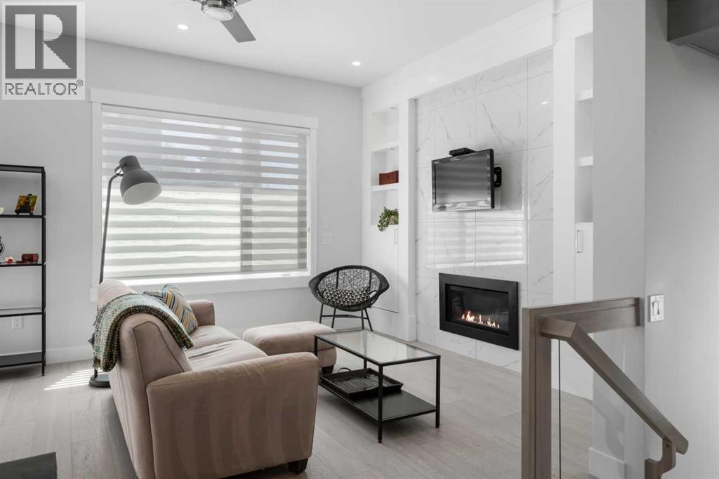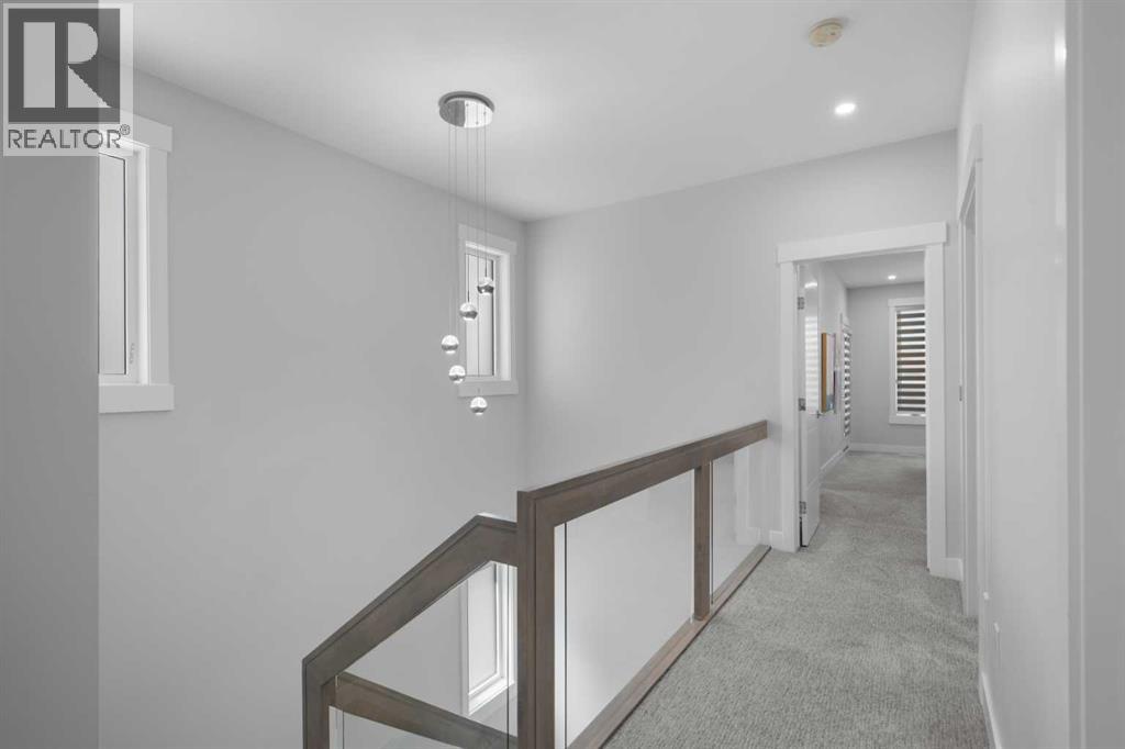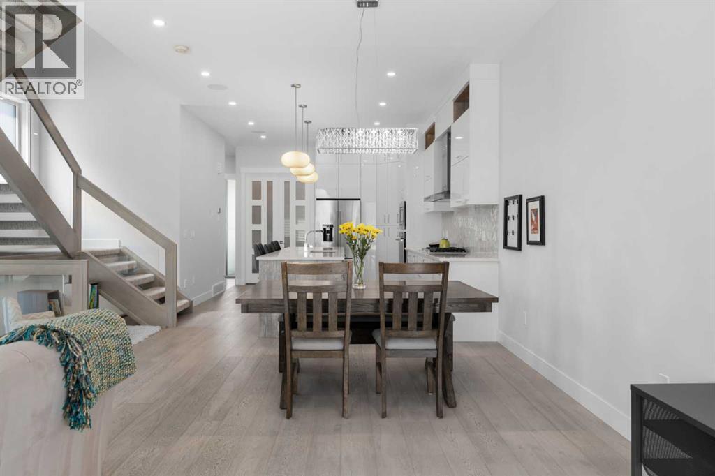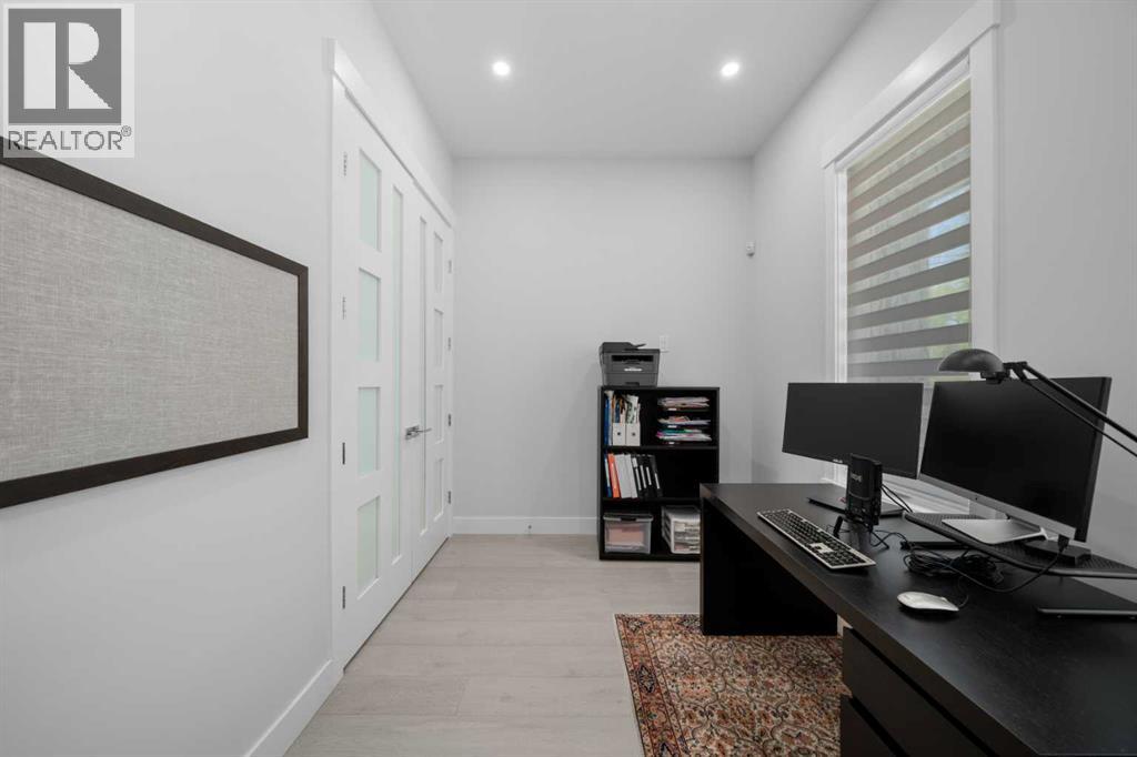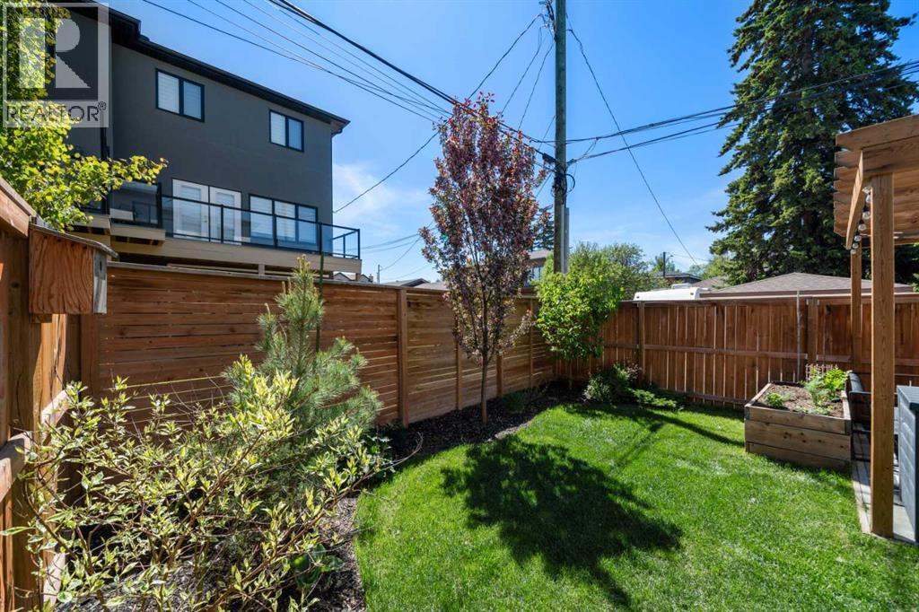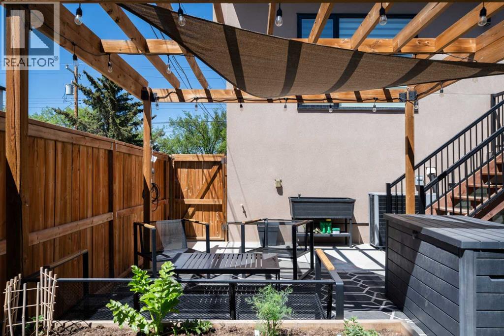 Discover modern living at its finest in this stunning two-storey semi-detached home, offering a rare under drive double attached garage and a stylish front veranda. Designed with exceptional attention to detail, this home boasts 4 bedrooms, 3.5 bathrooms, and air conditioning, ensuring year-round comfort. With heated floors in the primary ensuite, basement and even the garage giving you extra warmth. Step inside to a bright, open layout adorned with hardwood and tile flooring on the main level. The front office with French doors provides the perfect work-from-home space. The gourmet kitchen is a chef’s dream, featuring a large center island with quartz countertops, full-height high-gloss cabinets, a built-in stainless steel appliance package including a gas cooktop stove and chimney hood fan. Entertain effortlessly in the central dining room and rear living room, complete with a center gas fireplace with tile surround and built-ins, with seamless access to the backyard.Upstairs, retreat to the luxurious primary suite, boasting a private balcony with captivating city views. The spa-like 5-piece ensuite includes a dual vanity, a freestanding tub, and a custom glass shower, while the massive walk-in closet offers custom organizers and drawers. Two additional bedrooms, a 4-piece bathroom, and a convenient laundry room with a sink complete the upper level.The fully developed basement extends your living space with a cozy rec room, an additional bedroom, and a 4-piece bathroom—perfect for guests or family.The backyard is a true oasis, featuring an upper deck with stairs leading to a lower patio, a pergola, beautifully maintained gardens with a built-in planter, and a dedicated dog run.Situated on a corner lot next to an alley, this property shares only one attached neighbor and offers easy access to 17th Avenue and major roads, ensuring a quick commute in and out of the city. Make sure to click on the video tour icon! (id:51913)
