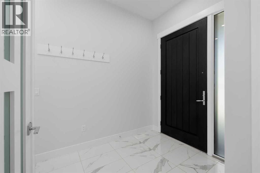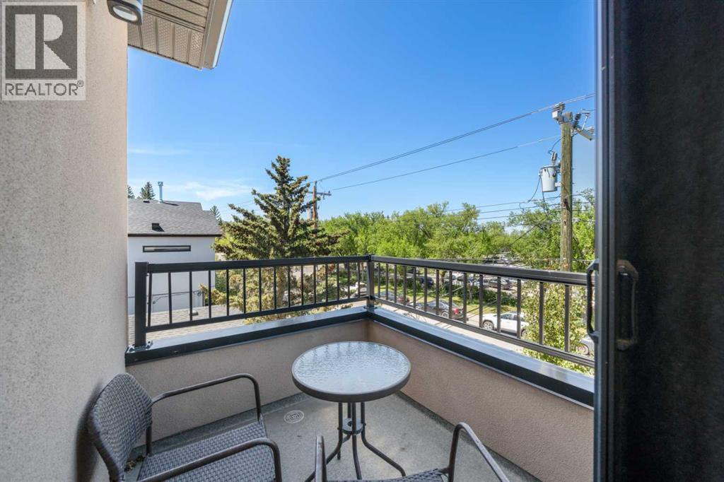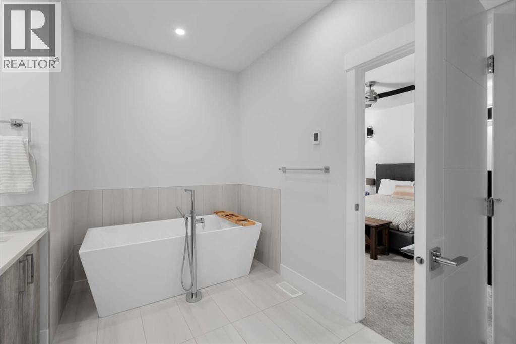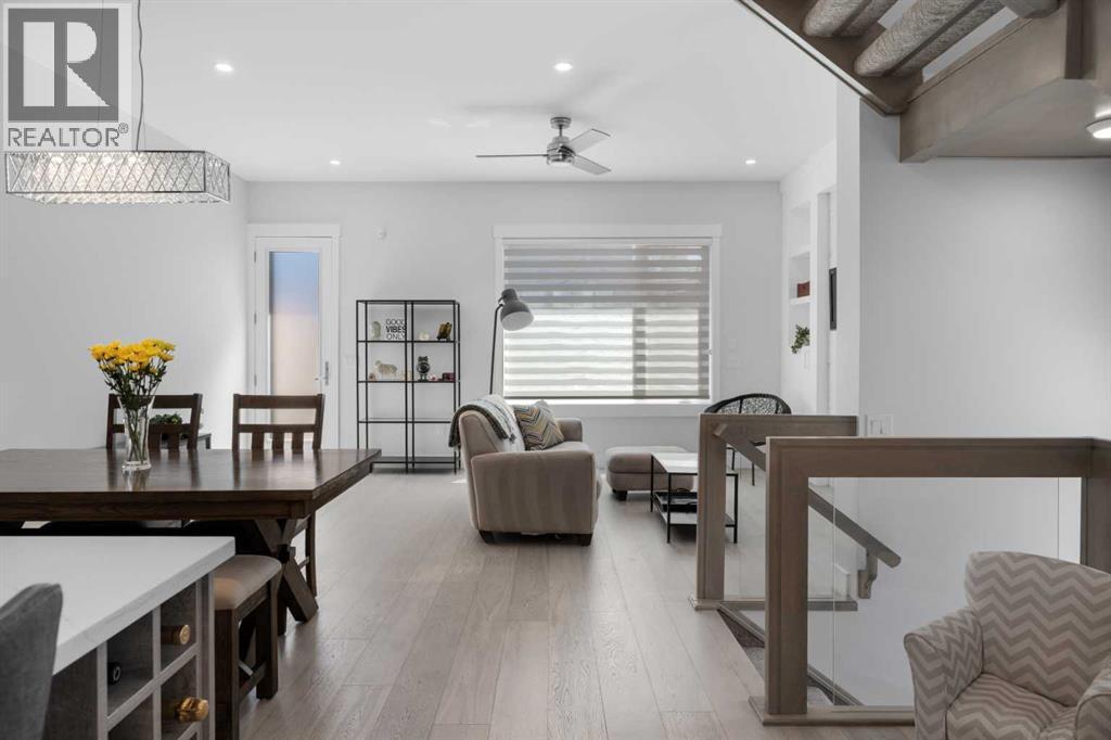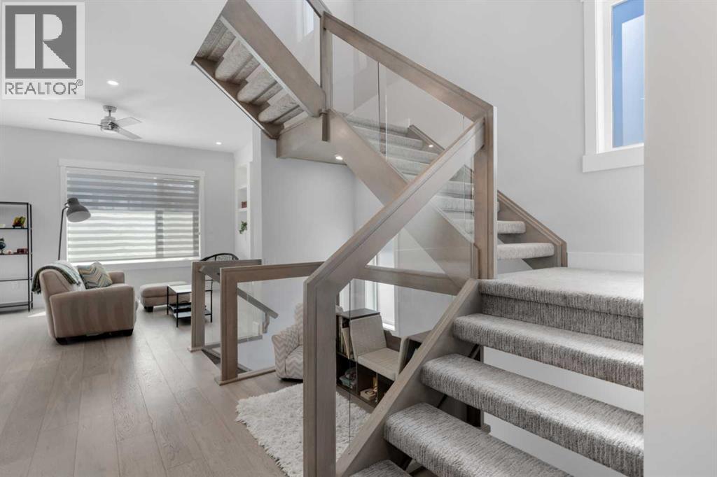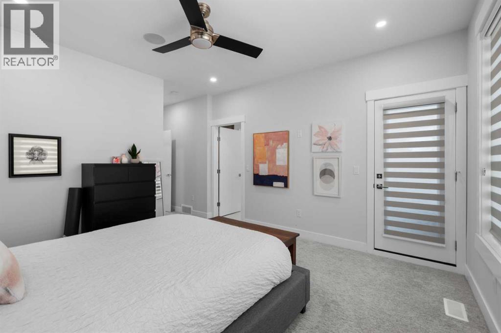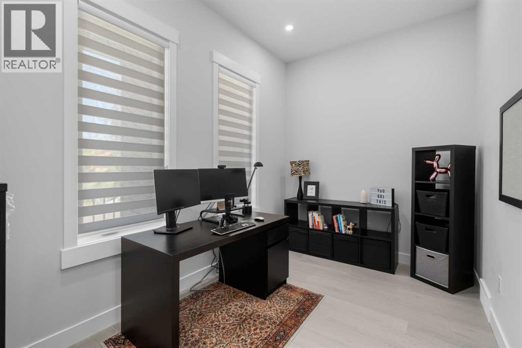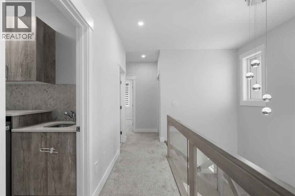 Discover modern living at its finest in this stunning two-storey semi-detached home, offering a rare under drive double attached garage and a stylish front veranda. Designed with exceptional attention to detail, this home boasts 4 bedrooms, 3.5 bathrooms, and air conditioning, ensuring year-round comfort. With heated floors in the primary ensuite, basement and even the garage giving you extra warmth. Step inside to a bright, open layout adorned with hardwood and tile flooring on the main level. The front office with French doors provides the perfect work-from-home space. The gourmet kitchen is a chef’s dream, featuring a large center island with quartz countertops, full-height high-gloss cabinets, a built-in stainless steel appliance package including a gas cooktop stove and chimney hood fan. Entertain effortlessly in the central dining room and rear living room, complete with a center gas fireplace with tile surround and built-ins, with seamless access to the backyard.Upstairs, retreat to the luxurious primary suite, boasting a private balcony with captivating city views. The spa-like 5-piece ensuite includes a dual vanity, a freestanding tub, and a custom glass shower, while the massive walk-in closet offers custom organizers and drawers. Two additional bedrooms, a 4-piece bathroom, and a convenient laundry room with a sink complete the upper level.The fully developed basement extends your living space with a cozy rec room, an additional bedroom, and a 4-piece bathroom—perfect for guests or family.The backyard is a true oasis, featuring an upper deck with stairs leading to a lower patio, a pergola, beautifully maintained gardens with a built-in planter, and a dedicated dog run.Situated on a corner lot next to an alley, this property shares only one attached neighbor and offers easy access to 17th Avenue and major roads, ensuring a quick commute in and out of the city. Make sure to click on the video tour icon! (id:51913)