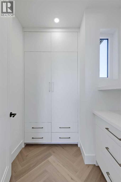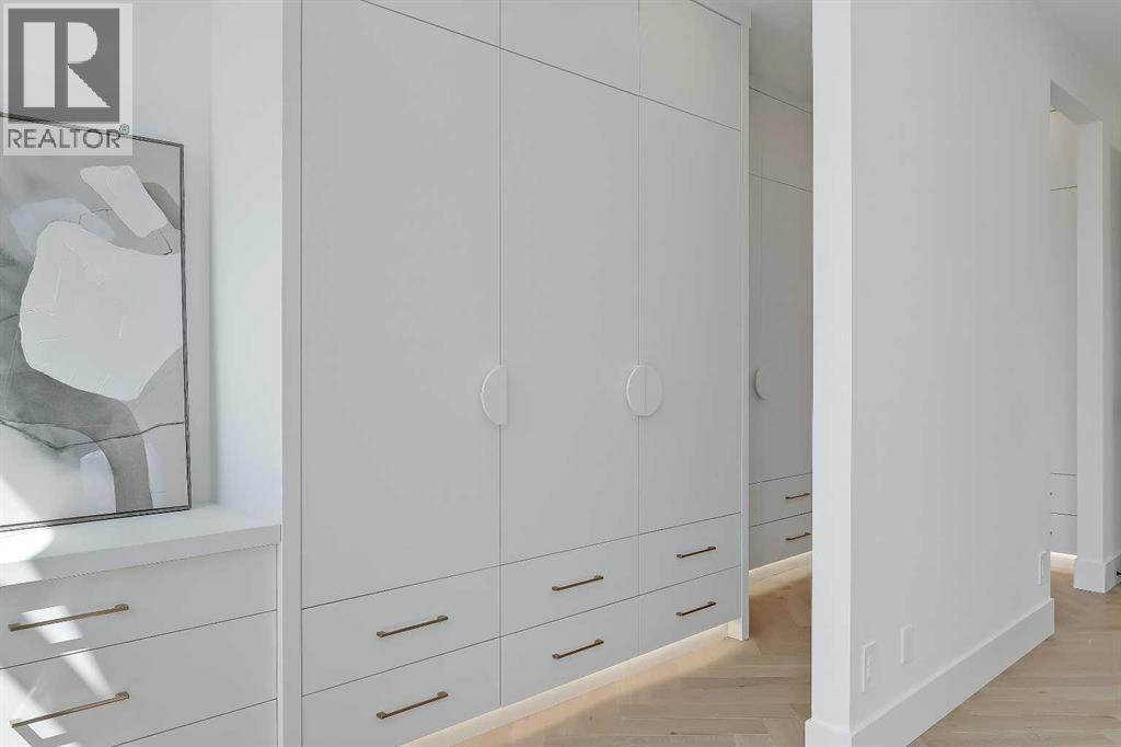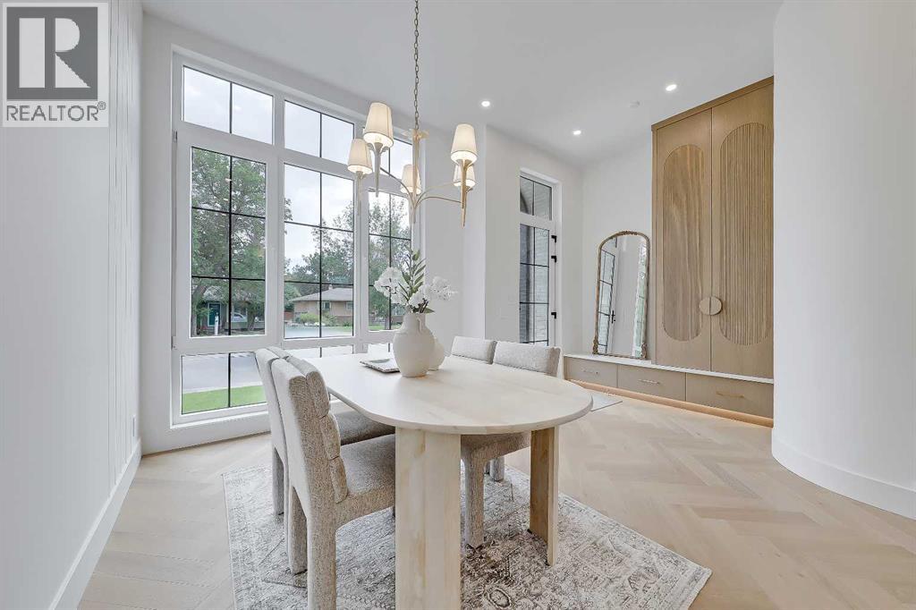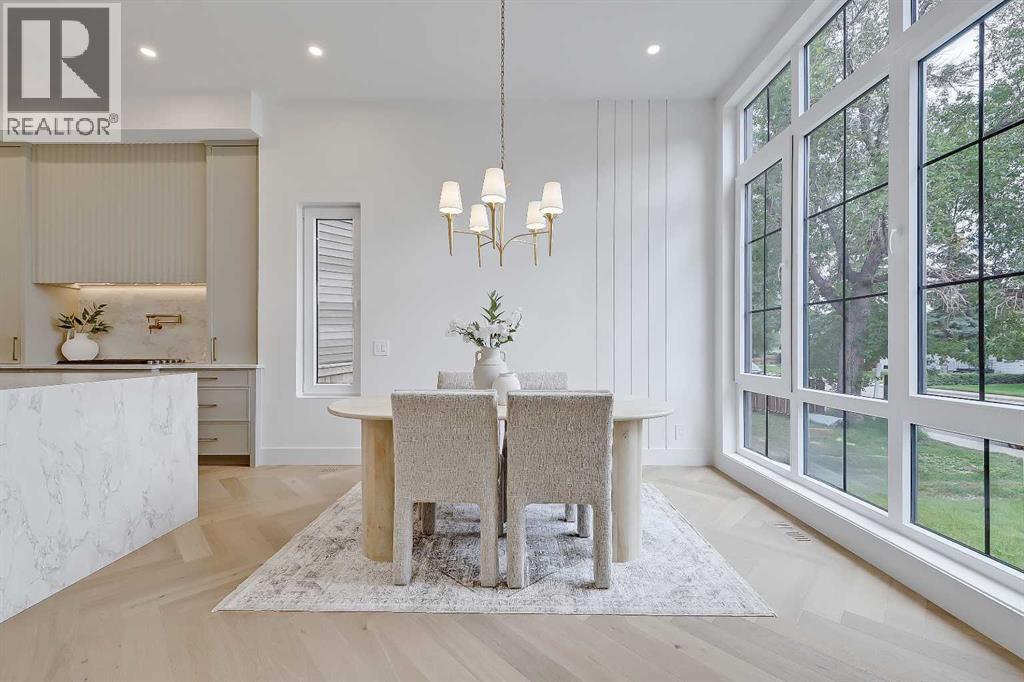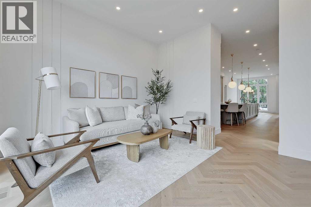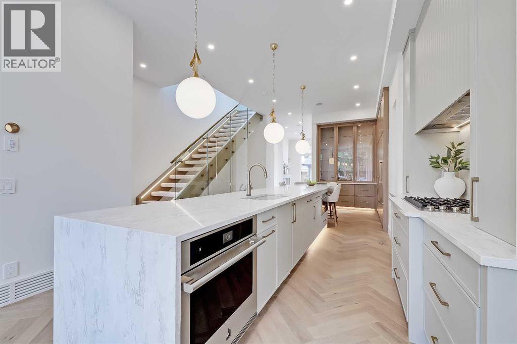 **Get $10,000 Back! Make your move into luxury living effortless with this exclusive buyer bonus.**Located in the heart of North Glenmore Park, this move-in-ready luxury detached infill by Black Label Designer Homes offers refined architecture, elevated finishes, and a thoughtfully designed layout on a quiet, tree-lined street near parks, schools, and the golf course. The main floor is anchored by 11-ft ceilings and wide-plank engineered white oak herringbone hardwood, setting a sophisticated tone from the moment you enter. A full-height glass front door opens to a welcoming foyer with custom millwork and integrated storage. The front dining room offers a more formal gathering space, while the central kitchen is a true showpiece, featuring full-height custom cabinetry and a sculptural, rounded quartz island with a waterfall edge.The upgraded JennAir RISE appliance package includes a 36” gas cooktop, built-in wall oven, under-counter microwave drawer, panel-ready refrigerator, and dishwasher. Additional highlights include a Blanco undermount sink, Delta faucet, pot filler, and integrated LED undermount and skirt lighting found throughout the home. The rear living room is filled with natural light and centred around an elegant gas fireplace with a custom porcelain two-tiered mitre mantle and built-in cabinetry.A functional mudroom connects to the detached double garage, offering quartz bench seating, custom storage, and everyday convenience. The powder room makes a bold design statement with a curved vanity, quartz surfaces, designer lighting, and a VOVO smart bidet toilet.Upstairs, the vaulted primary suite features open wood beams, oversized windows, and a walk-through closet with custom built-in millwork and LED lighting. The spa-inspired ensuite includes a freestanding soaker tub, dual vessel sinks, quartz counters, a built-in steam shower with body jets, and a skylight. All bathrooms throughout the home feature in-floor heating and VOVO smart bidet toil ets, including the upper main bath with a wood slat feature wall. The upper laundry room is finished with quartz counters, designer tile backsplash, custom cabinetry, and a hanging rod. Two spacious secondary bedrooms with walk-in closets complete the upper level.The fully developed basement expands the living space with a large recreation room, fourth bedroom or gym, full bathroom, and a striking wet bar with quartz countertops, island, dishwasher, and bar sink—ideal for entertaining. A tankless hot water heater ensures year-round comfort.North Glenmore Park is one of Calgary’s most desirable inner-city communities, offering a rare blend of tranquility and convenience. Steps from Glenmore Athletic Park, Sandy Beach, and the Elbow River pathway system, and walking distance to North Glenmore Park School and Central Memorial High School, with quick access to Mount Royal University, Lakeview Golf Course, Marda Loop, and major routes including Crowchild, Glenmore, and Sarcee Trail. (id:51913)
