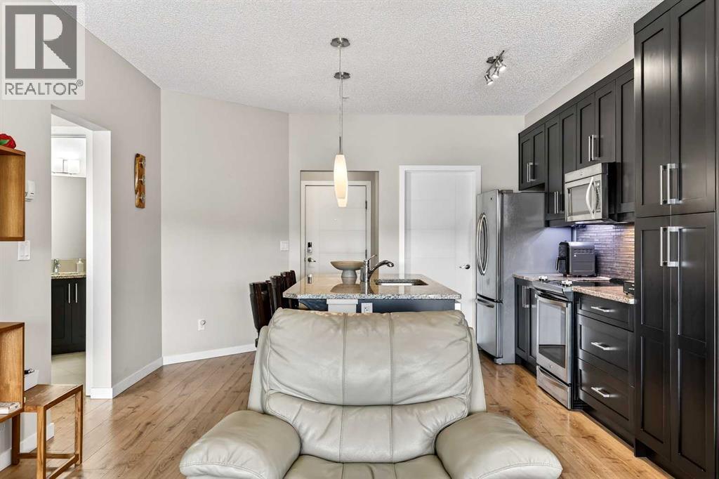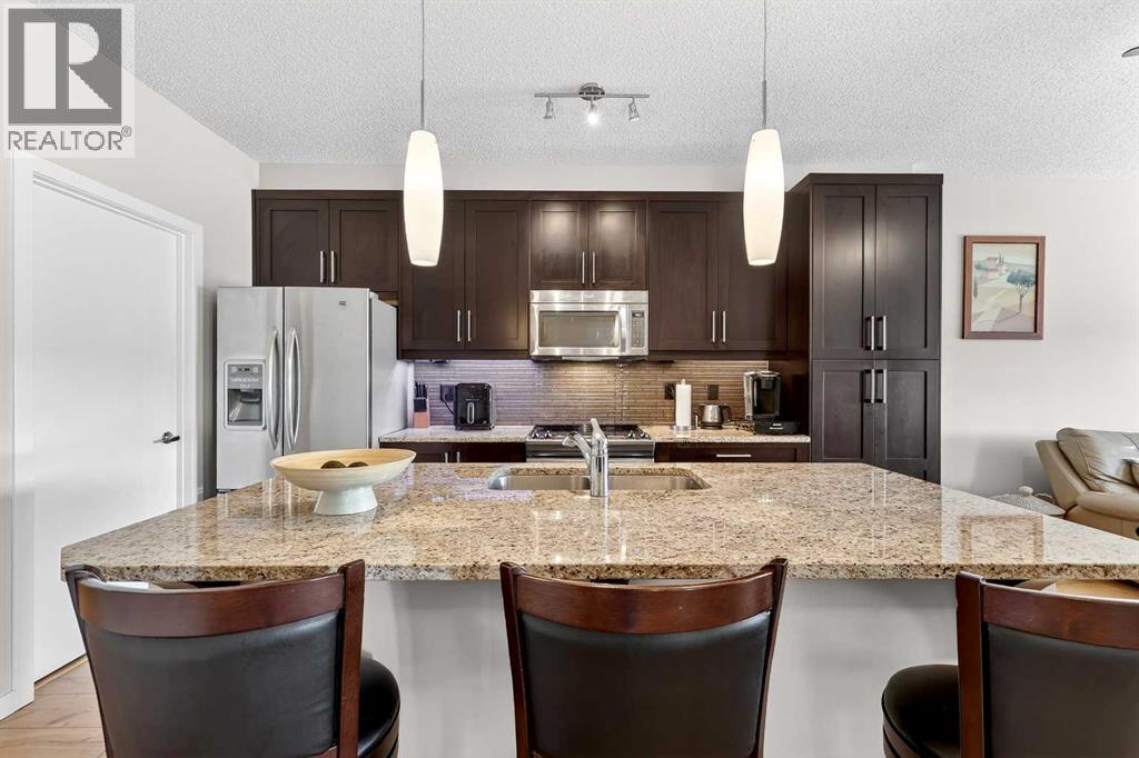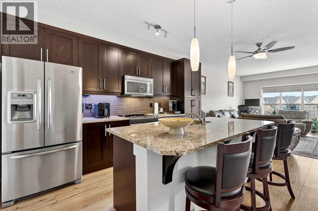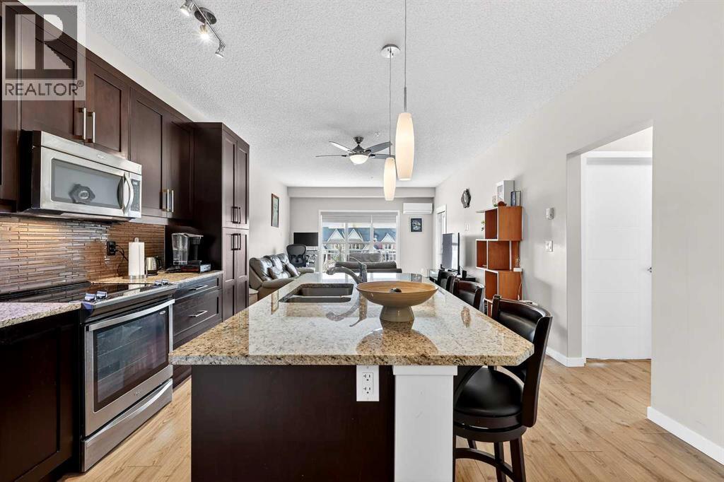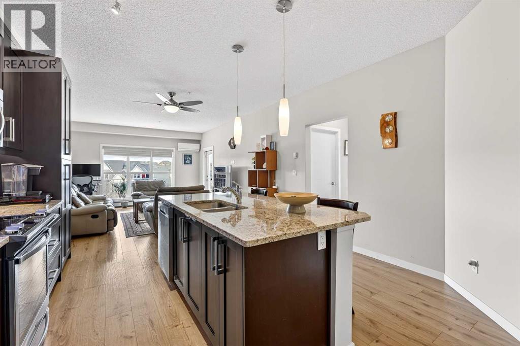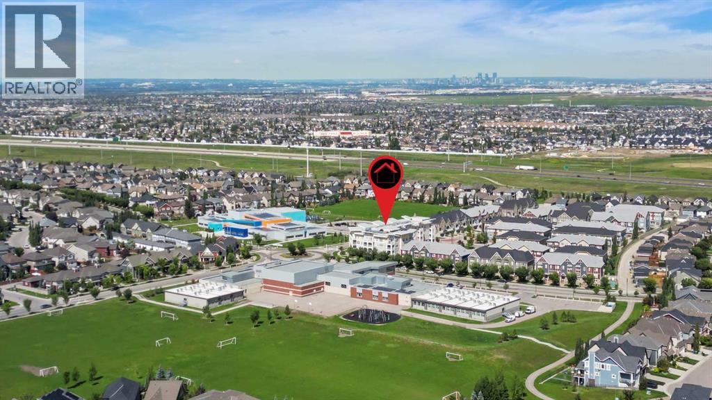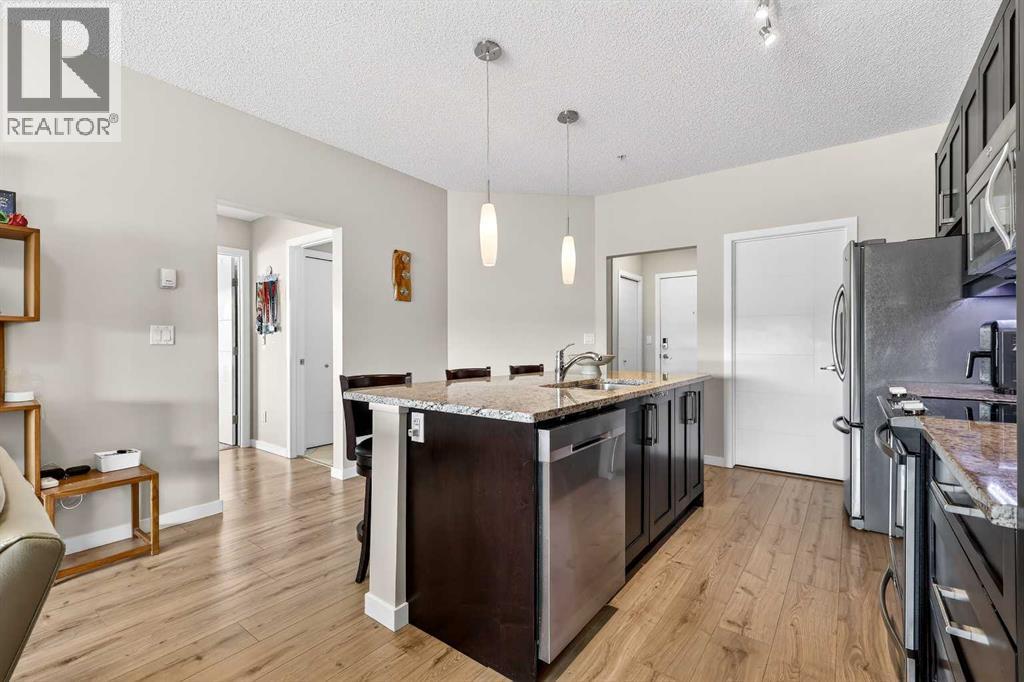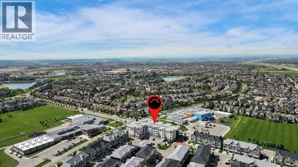 Welcome to Ebony in Mahogany—where elevated condo living meets the beauty and lifestyle of Calgary’s premier lake community. Perfectly positioned on the third floor with a coveted southwest exposure, this stunning and spacious apartment offers one of the largest floorplans in the complex, paired with an abundance of natural light and thoughtful design that sets it apart from the rest. From the moment you step inside, you are greeted by soaring ceilings just under 9 feet and oversized windows in both the living room and primary suite—creating a bright, open atmosphere that feels expansive and inviting. Bathed in warm evening sunlight, this home offers a truly special ambiance to be enjoyed throughout all four seasons. The kitchen is both stylish and functional, featuring rich dark cabinetry, elegant granite countertops, and a full stainless steel appliance package. A generous walk-in pantry provides exceptional storage and organization, while in-suite laundry adds everyday convenience. The kitchen flows seamlessly into the open-concept living and dining area, where warm-toned laminate flooring grounds the space and creates a cohesive, welcoming feel. The primary suite is a peaceful retreat, complete with a walk-through closet and a beautifully appointed 3-piece ensuite featuring granite countertops, timeless tile flooring, and an oversized walk-in shower with sleek glass doors. The second bedroom is equally impressive, offering a unique layout with a charming niche perfect for a reading nook, a Murphy bed for added versatility, and easy access to the 4-piece main bathroom—ideal for guests or family. This home is loaded with additional features that elevate everyday living, including air conditioning, a spacious private deck with BBQ gas line, and the rare bonus of two tandem parking stalls. Residents of Ebony also enjoy access to an on-site fitness facility, playground, visitor parking, and the added peace of mind that comes with nearby traffic-calming school zones. The location is simply unbeatable—just a few blocks from Mahogany’s private lake and beach club, and directly across the street from two schools. Enjoy endless opportunities for outdoor living with nearby parks, pathways, and playgrounds, along with convenient access to shopping, dining, and major routes in and out of the community. This is more than a condo—it’s a lifestyle defined by light, space, and the vibrant energy of lake living. If you’ve been searching for a home that offers exceptional design, incredible exposure, and everyday comfort in one of Calgary’s most sought-after communities, this is the one. (id:51913)