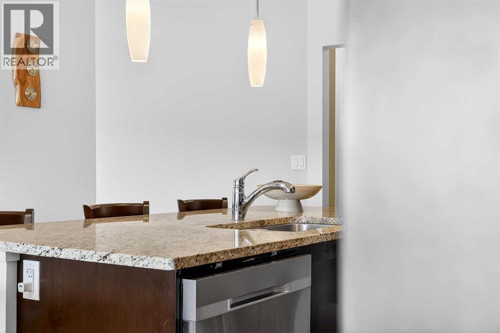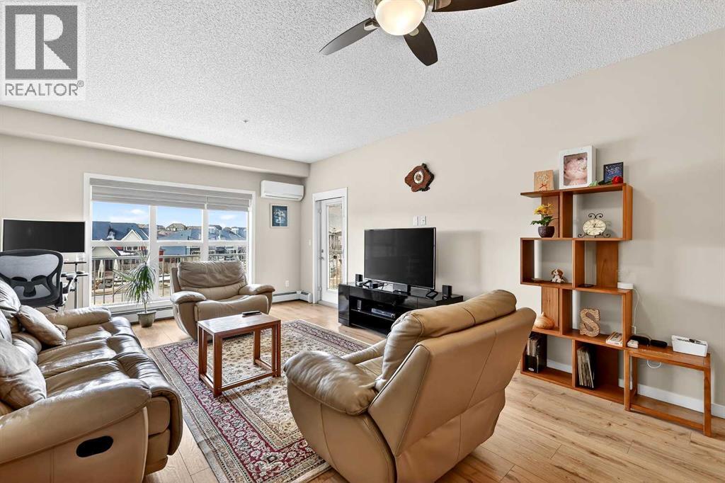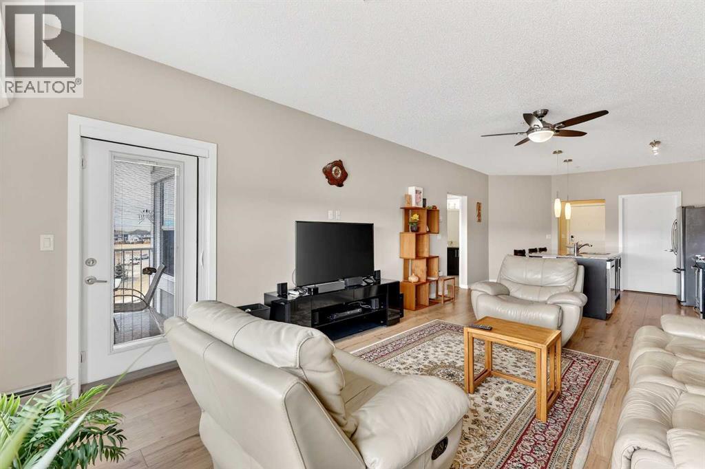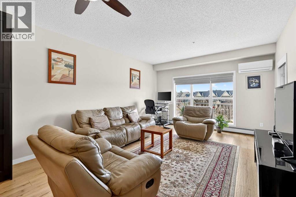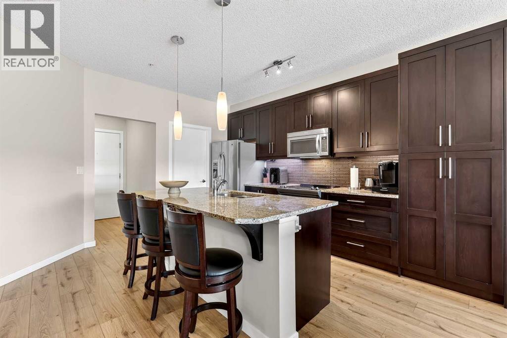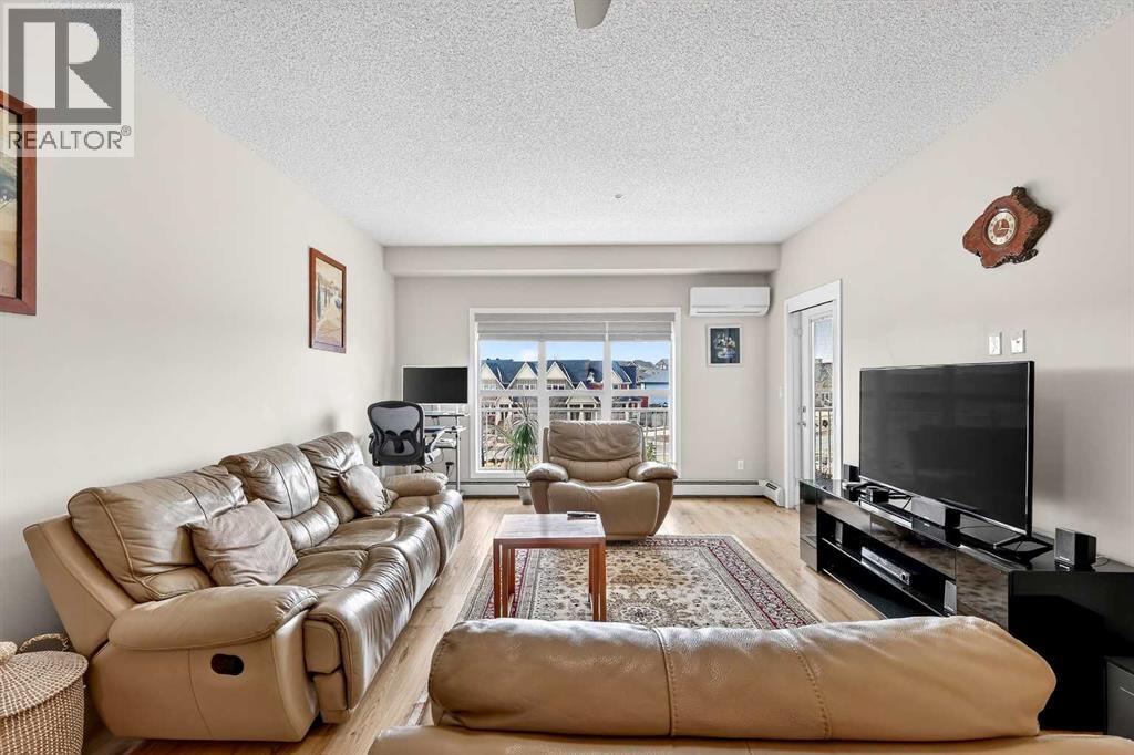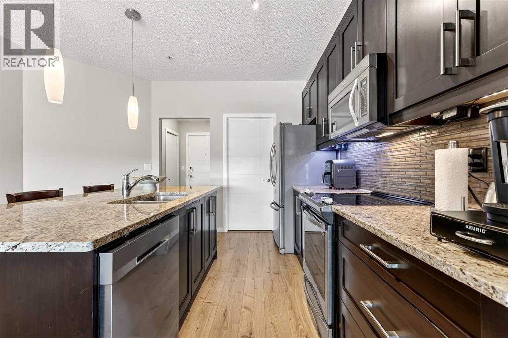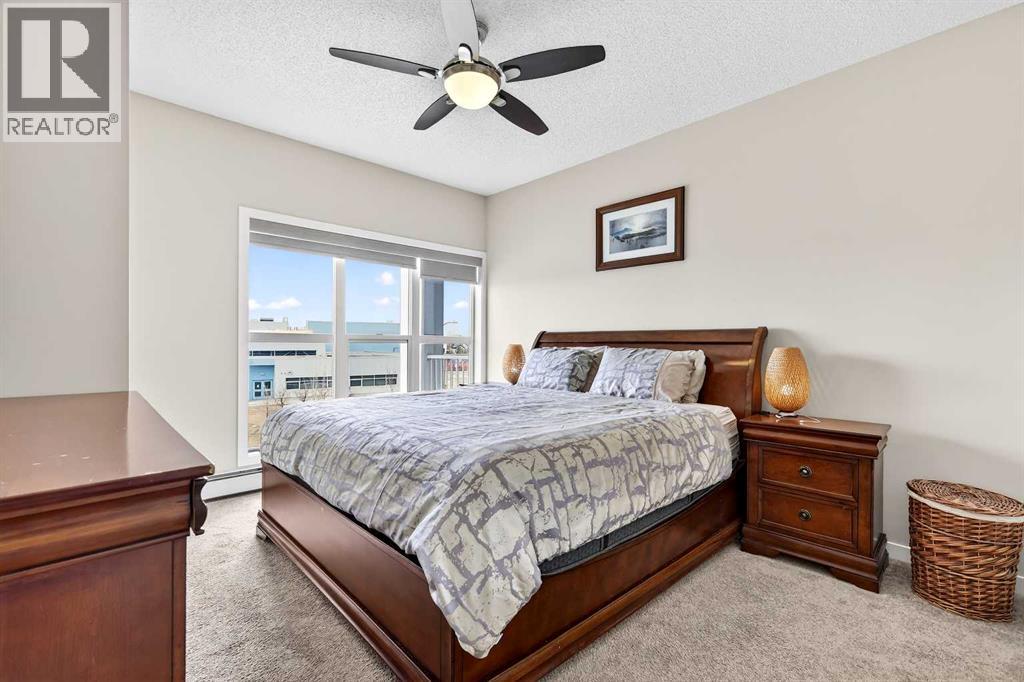 Welcome to Ebony in Mahogany—where elevated condo living meets the beauty and lifestyle of Calgary’s premier lake community. Perfectly positioned on the third floor with a coveted southwest exposure, this stunning and spacious apartment offers one of the largest floorplans in the complex, paired with an abundance of natural light and thoughtful design that sets it apart from the rest. From the moment you step inside, you are greeted by soaring ceilings just under 9 feet and oversized windows in both the living room and primary suite—creating a bright, open atmosphere that feels expansive and inviting. Bathed in warm evening sunlight, this home offers a truly special ambiance to be enjoyed throughout all four seasons. The kitchen is both stylish and functional, featuring rich dark cabinetry, elegant granite countertops, and a full stainless steel appliance package. A generous walk-in pantry provides exceptional storage and organization, while in-suite laundry adds everyday convenience. The kitchen flows seamlessly into the open-concept living and dining area, where warm-toned laminate flooring grounds the space and creates a cohesive, welcoming feel. The primary suite is a peaceful retreat, complete with a walk-through closet and a beautifully appointed 3-piece ensuite featuring granite countertops, timeless tile flooring, and an oversized walk-in shower with sleek glass doors. The second bedroom is equally impressive, offering a unique layout with a charming niche perfect for a reading nook, a Murphy bed for added versatility, and easy access to the 4-piece main bathroom—ideal for guests or family. This home is loaded with additional features that elevate everyday living, including air conditioning, a spacious private deck with BBQ gas line, and the rare bonus of two tandem parking stalls. Residents of Ebony also enjoy access to an on-site fitness facility, playground, visitor parking, and the added peace of mind that comes with nearby traffic-calming school zones. The location is simply unbeatable—just a few blocks from Mahogany’s private lake and beach club, and directly across the street from two schools. Enjoy endless opportunities for outdoor living with nearby parks, pathways, and playgrounds, along with convenient access to shopping, dining, and major routes in and out of the community. This is more than a condo—it’s a lifestyle defined by light, space, and the vibrant energy of lake living. If you’ve been searching for a home that offers exceptional design, incredible exposure, and everyday comfort in one of Calgary’s most sought-after communities, this is the one. (id:51913)