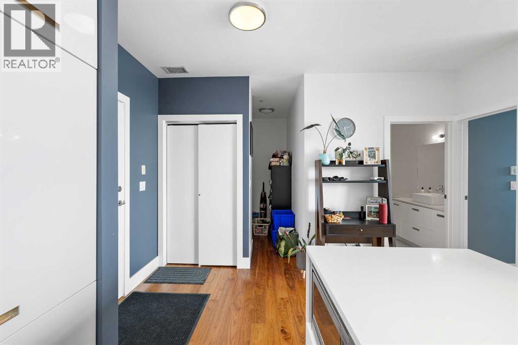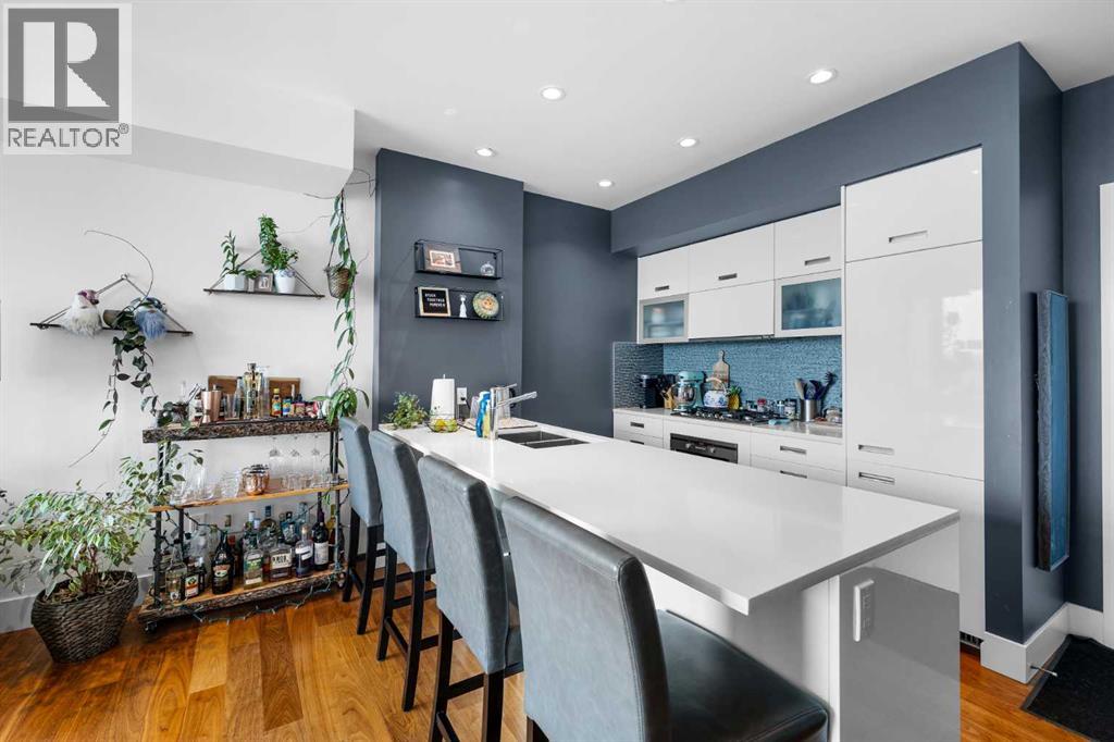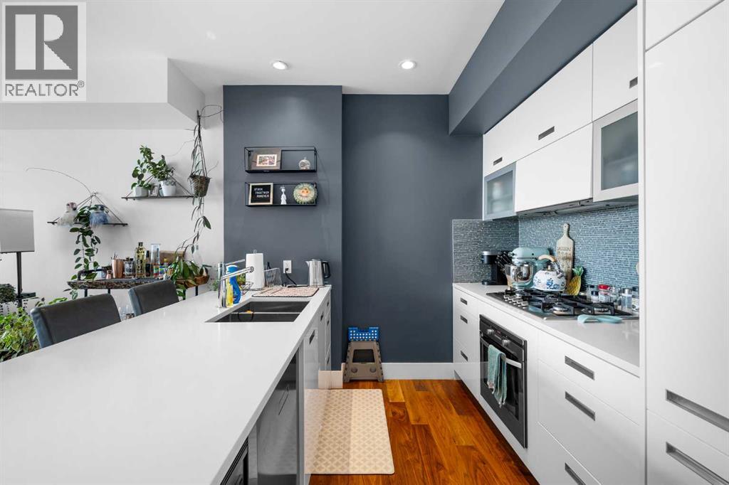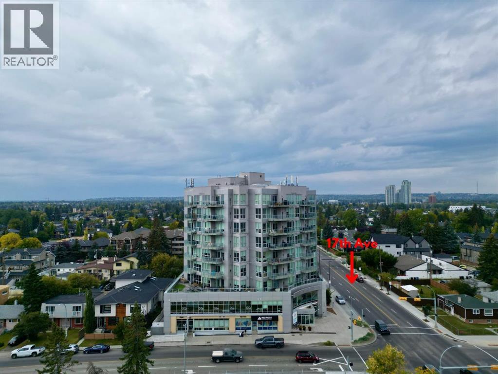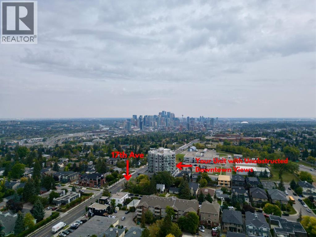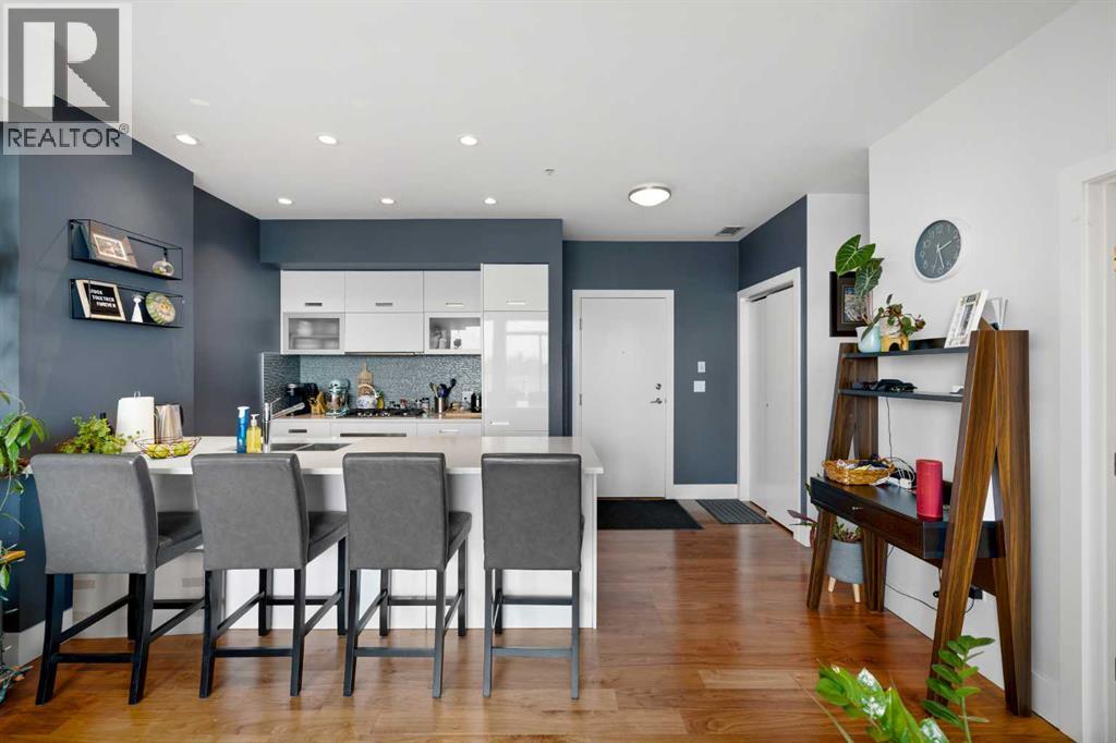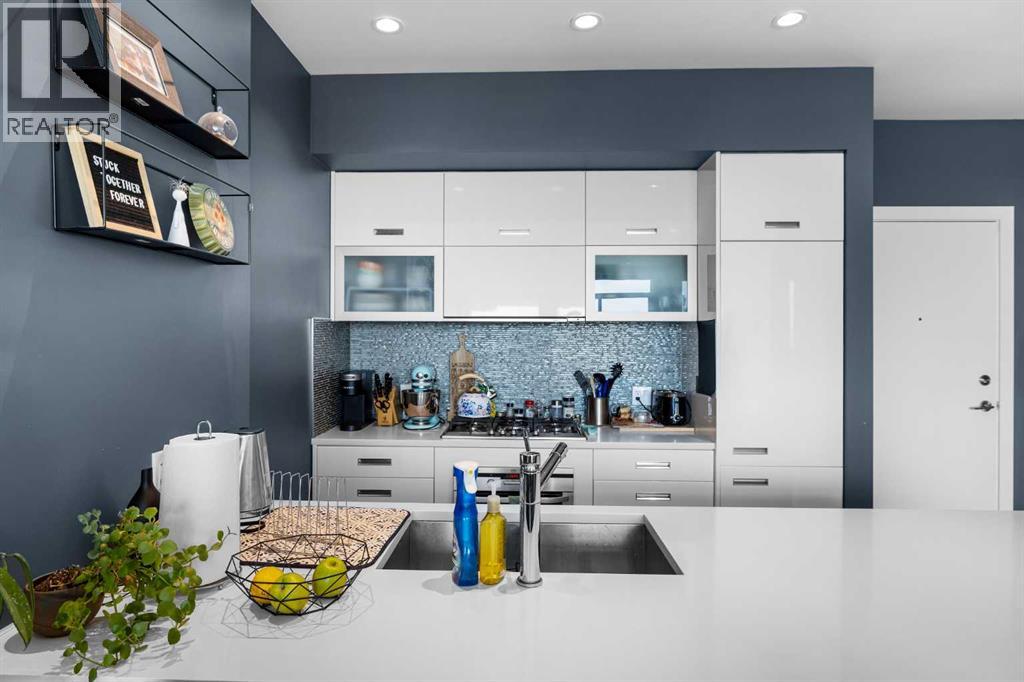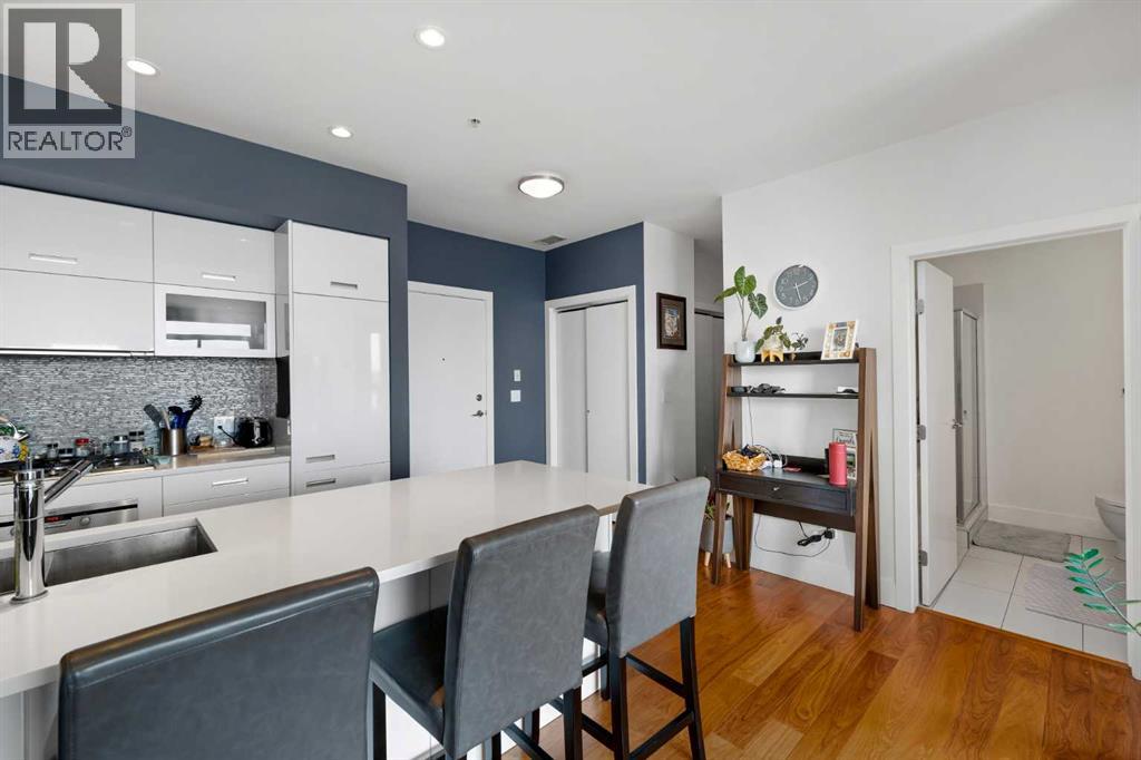 Step into modern urban living with this oversized one-bedroom unit, where floor-to-ceiling windows and an airy open-concept layout create a bright and inviting atmosphere. The spacious main foyer welcomes you into this thoughtfully designed home, leading seamlessly to the heart of the unit—the sleek and contemporary kitchen. Featuring a gas cooktop, stainless steel appliances, quartz countertops, and custom-fitted cabinetry, this culinary space is as functional as it is stylish. A convenient breakfast bar offers a casual dining option, while an adjacent area provides room for more formal dining. Beyond the kitchen, the living room is a showstopper, bathed in natural light from the expansive windows that frame stunning east-facing views of downtown. Generously sized, this space effortlessly connects to the open floor plan, offering both comfort and versatility. Step outside onto the large private deck, where the city skyline serves as the perfect backdrop for relaxing mornings or entertaining guests. The spacious bedroom, located just off the main living area, continues the theme of light and openness with its own floor-to-ceiling windows and captivating downtown views. Designed for convenience, the elegantly finished bathroom is easily accessible from both the bedroom and the main living space. This premium unit also comes with valuable extras, including a heated underground parking stall, a secure storage unit, and dedicated bike storage—ideal for urban dwellers seeking both comfort and practicality. Perfectly positioned on vibrant 17th Avenue, this residence offers quick access to the best dining, entertainment, and amenities the city has to offer. With in-unit laundry and a smartly designed layout that maximizes every inch of space, central air conditioning and the availability of fiber optic data - this modern apartment stands out with its premium finishes and unparalleled location. To top it off, buyers have the opportunity to assume a 1.79% MORTGAGE RATE until July 2026. Don't miss out on this exceptional inner-city home! (id:51913)