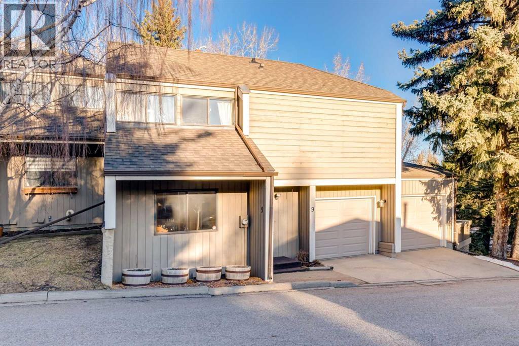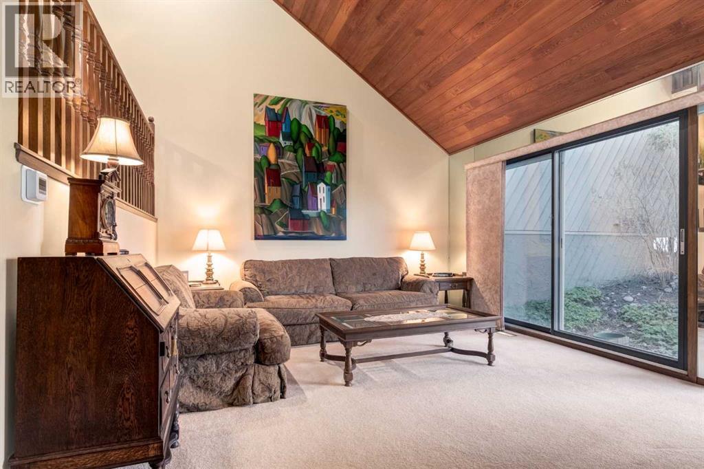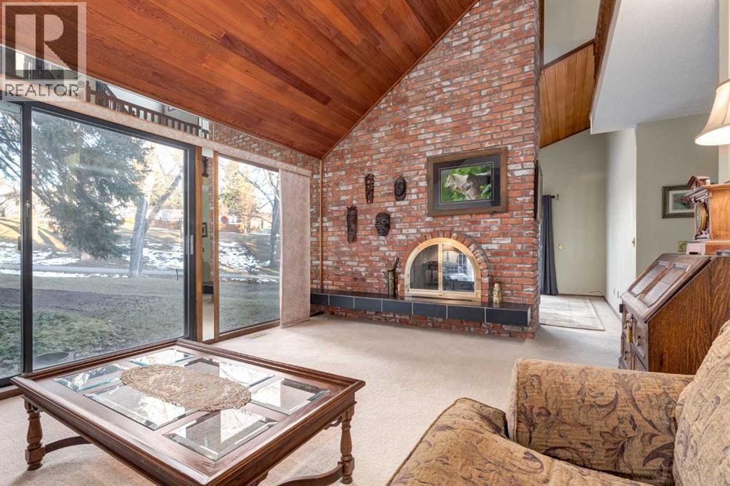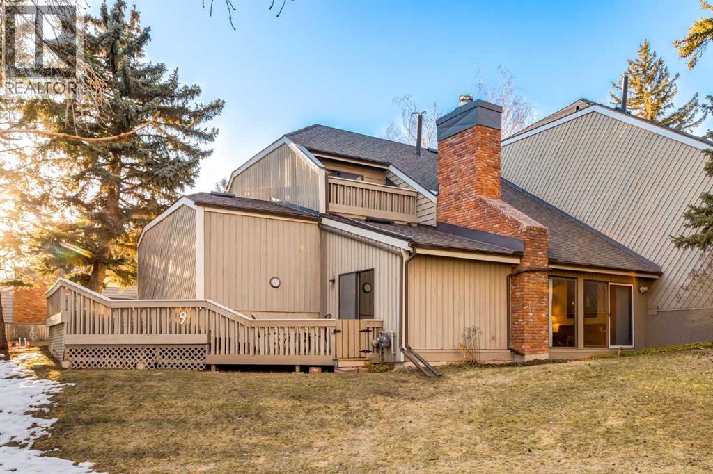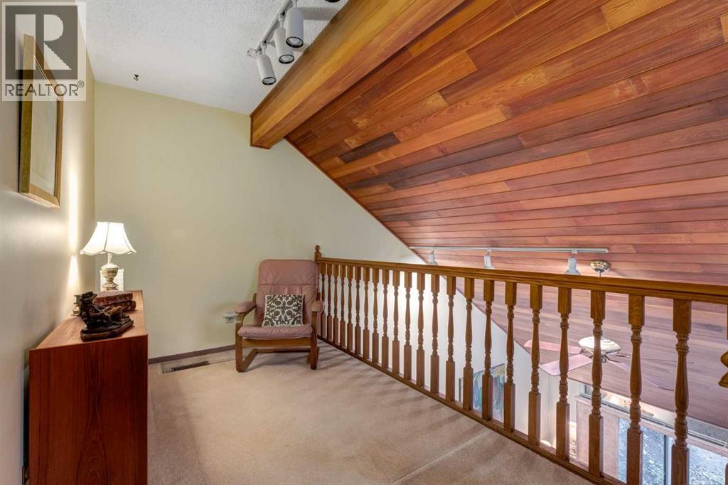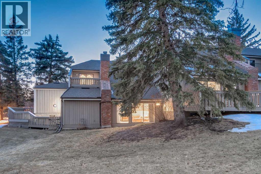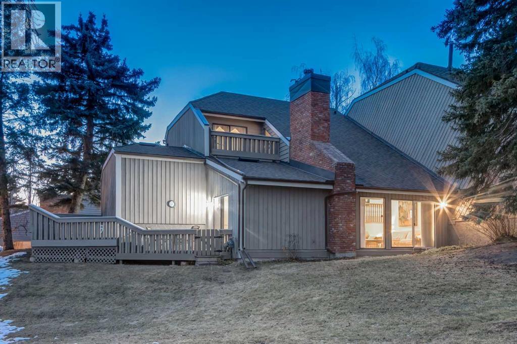 This mid-century modern townhome is an end unit next to a grove of mature trees and overlooking a park. The Bow River Pathway is just beyond the back yard and provides a direct, 15-minute walk to the river and all the surrounding amenities including off-leash dog parks, swimming areas and beaches. Built in 1972, this home is mostly original with the exception of a brand-new furnace and hot water tank, a three-year-old washer and dryer and newer stainless-steel appliances. As you enter this welcoming home, you are transported back in time to an era where quality and longevity were valued. Throughout the home you will find details that have become ‘too expensive’ to include in homes today such as solid wood, masonry and plywood subfloors. Renovations of properties from this era are incredible because the ‘bones’ are solid and the opportunity to incorporate original features adds a charm that cannot be replicated. A soaring vaulted ceiling clad in cedar tongue and grove boards runs up the East side of the home and houses a winding staircase lined with open spindle railing that showcases the multi-levels. A two-sided brick fireplace separates the family and living rooms and runs from floor to ceiling, following the sharp line of the vault. These amazing features are classic 1970s styling and look amazing incorporated into a renovation. A main entrance with a solid wood door featuring carved quatrefoil design panels and a charming brass letter box leads to a sunny kitchen with a breakfast nook. The formal dining room looks over the living room, and a private powder is located next to the double attached garage. A primary suite with an ensuite and a private balcony, a second bedroom, a full bathroom and an airy bonus room are located on the upper level. The basement is finished and offers an additional full bathroom, a cozy den and a flex room. A two-level deck is fully enclosed for maximum privacy and a safe place for pets and the mature trees and shrubs that adorn the yard blend seamlessly into the park and pathway beyond. (id:51913)