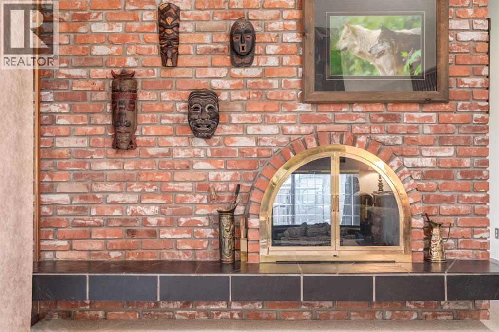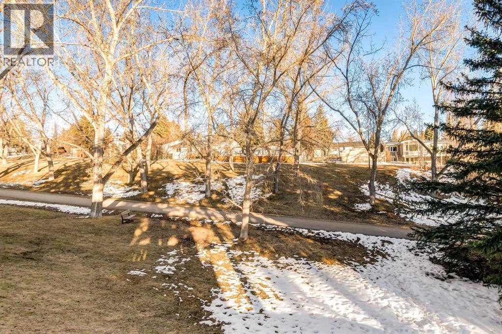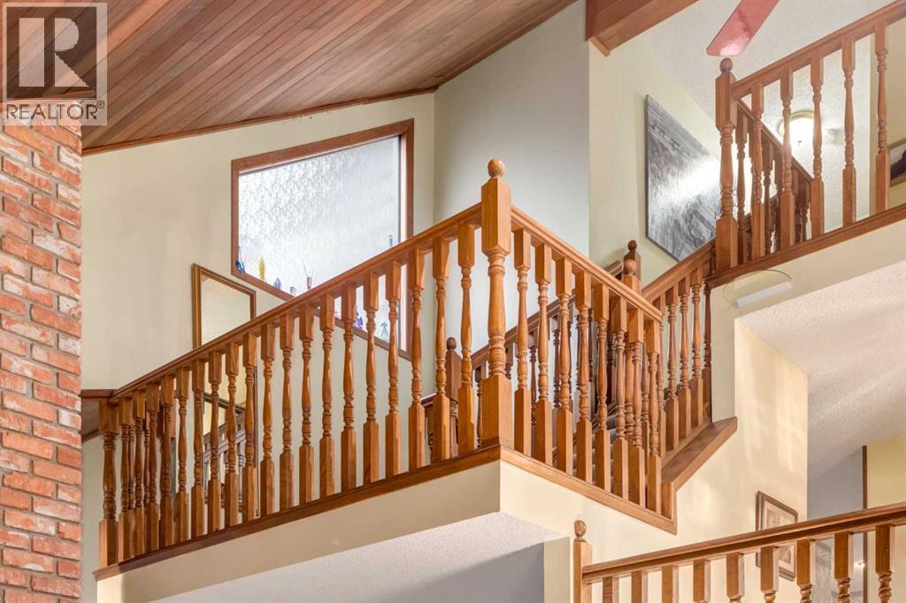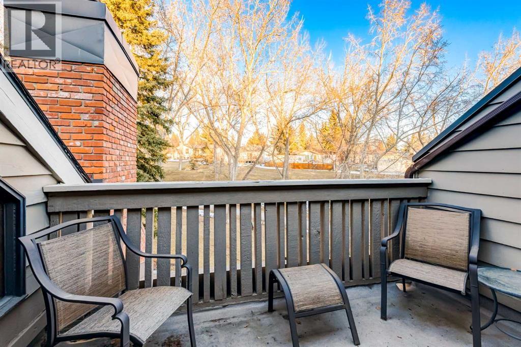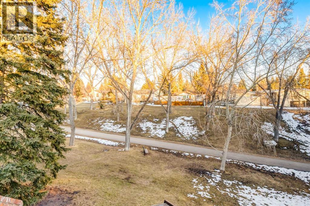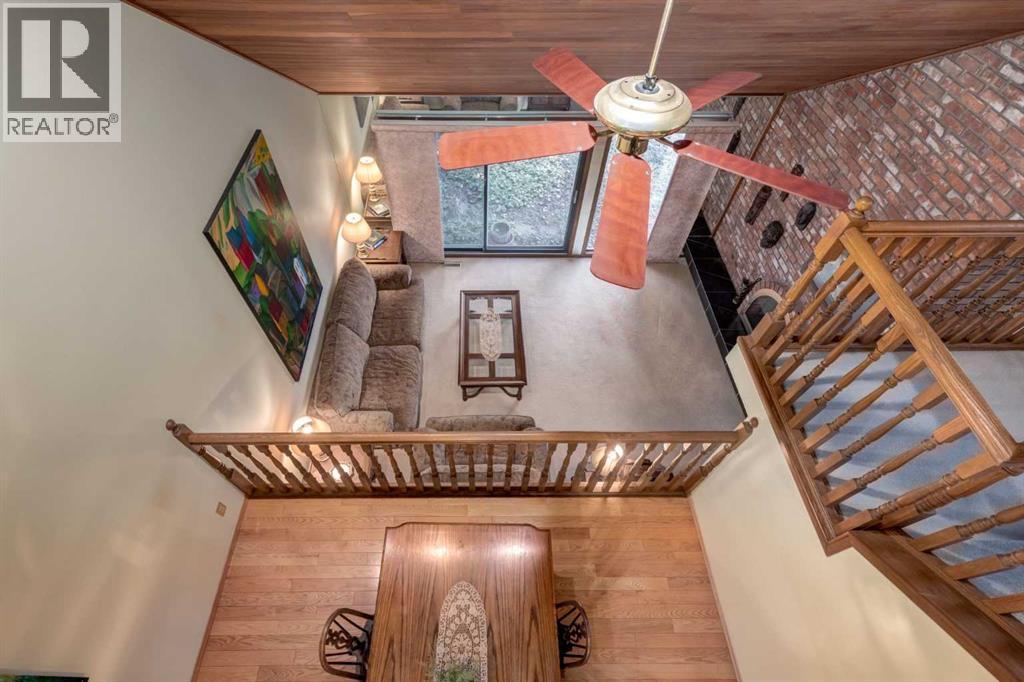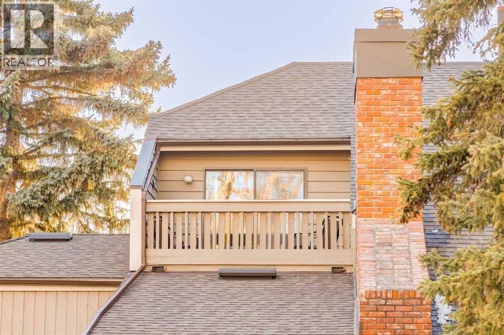 This mid-century modern townhome is an end unit next to a grove of mature trees and overlooking a park. The Bow River Pathway is just beyond the back yard and provides a direct, 15-minute walk to the river and all the surrounding amenities including off-leash dog parks, swimming areas and beaches. Built in 1972, this home is mostly original with the exception of a brand-new furnace and hot water tank, a three-year-old washer and dryer and newer stainless-steel appliances. As you enter this welcoming home, you are transported back in time to an era where quality and longevity were valued. Throughout the home you will find details that have become ‘too expensive’ to include in homes today such as solid wood, masonry and plywood subfloors. Renovations of properties from this era are incredible because the ‘bones’ are solid and the opportunity to incorporate original features adds a charm that cannot be replicated. A soaring vaulted ceiling clad in cedar tongue and grove boards runs up the East side of the home and houses a winding staircase lined with open spindle railing that showcases the multi-levels. A two-sided brick fireplace separates the family and living rooms and runs from floor to ceiling, following the sharp line of the vault. These amazing features are classic 1970s styling and look amazing incorporated into a renovation. A main entrance with a solid wood door featuring carved quatrefoil design panels and a charming brass letter box leads to a sunny kitchen with a breakfast nook. The formal dining room looks over the living room, and a private powder is located next to the double attached garage. A primary suite with an ensuite and a private balcony, a second bedroom, a full bathroom and an airy bonus room are located on the upper level. The basement is finished and offers an additional full bathroom, a cozy den and a flex room. A two-level deck is fully enclosed for maximum privacy and a safe place for pets and the mature trees and shrubs that adorn the yard blend seamlessly into the park and pathway beyond. (id:51913)
