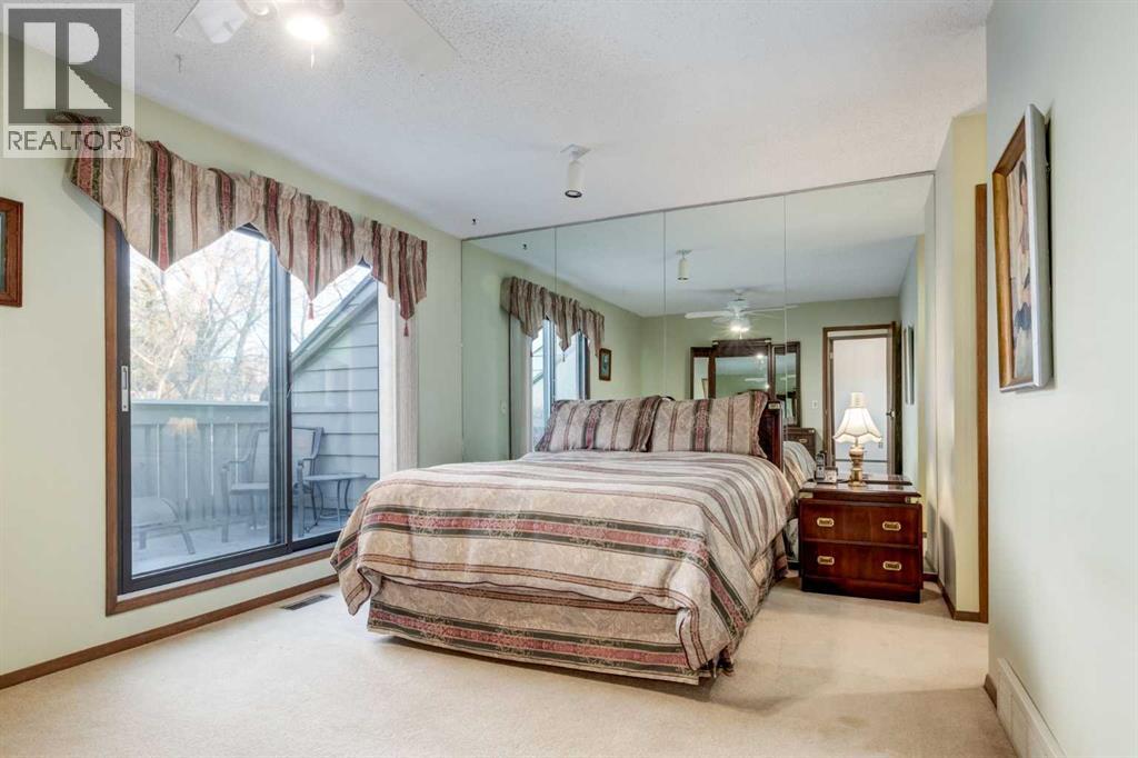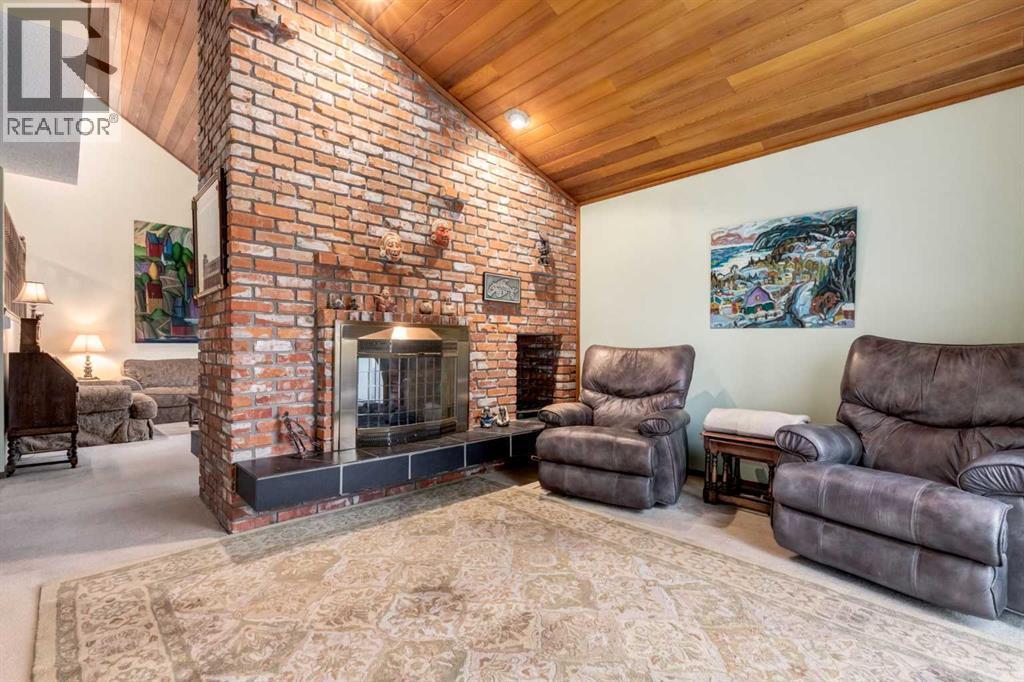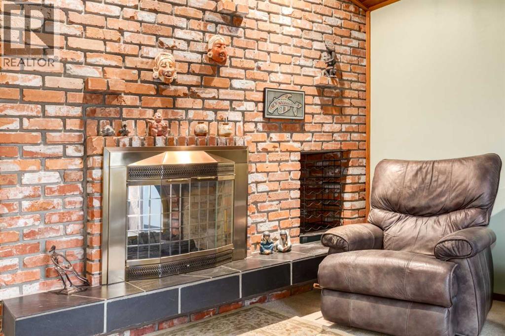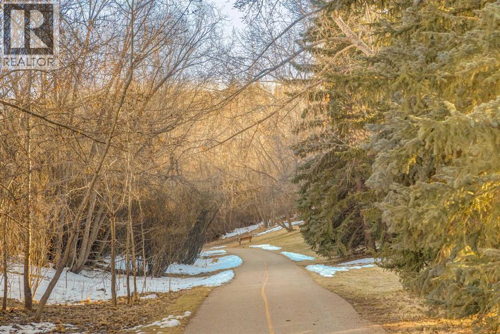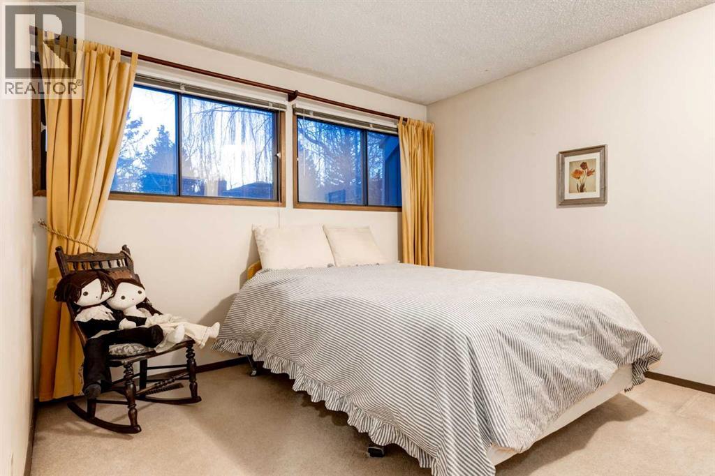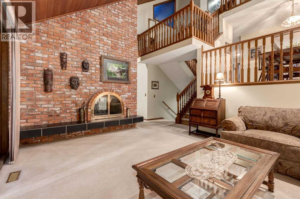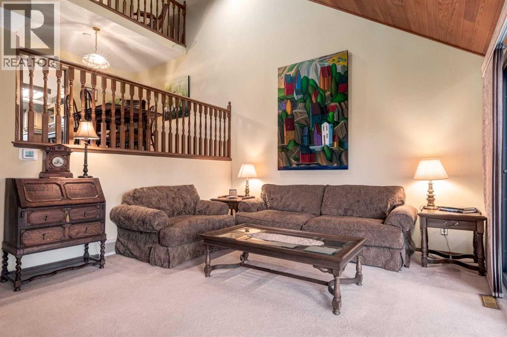 This mid-century modern townhome is an end unit next to a grove of mature trees and overlooking a park. The Bow River Pathway is just beyond the back yard and provides a direct, 15-minute walk to the river and all the surrounding amenities including off-leash dog parks, swimming areas and beaches. Built in 1972, this home is mostly original with the exception of a brand-new furnace and hot water tank, a three-year-old washer and dryer and newer stainless-steel appliances. As you enter this welcoming home, you are transported back in time to an era where quality and longevity were valued. Throughout the home you will find details that have become ‘too expensive’ to include in homes today such as solid wood, masonry and plywood subfloors. Renovations of properties from this era are incredible because the ‘bones’ are solid and the opportunity to incorporate original features adds a charm that cannot be replicated. A soaring vaulted ceiling clad in cedar tongue and grove boards runs up the East side of the home and houses a winding staircase lined with open spindle railing that showcases the multi-levels. A two-sided brick fireplace separates the family and living rooms and runs from floor to ceiling, following the sharp line of the vault. These amazing features are classic 1970s styling and look amazing incorporated into a renovation. A main entrance with a solid wood door featuring carved quatrefoil design panels and a charming brass letter box leads to a sunny kitchen with a breakfast nook. The formal dining room looks over the living room, and a private powder is located next to the double attached garage. A primary suite with an ensuite and a private balcony, a second bedroom, a full bathroom and an airy bonus room are located on the upper level. The basement is finished and offers an additional full bathroom, a cozy den and a flex room. A two-level deck is fully enclosed for maximum privacy and a safe place for pets and the mature trees and shrubs that adorn the yard blend seamlessly into the park and pathway beyond. (id:51913)