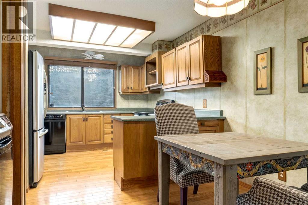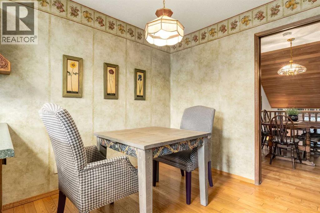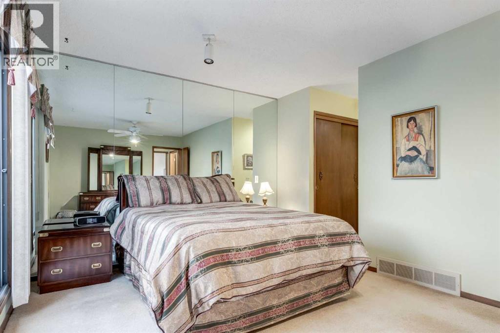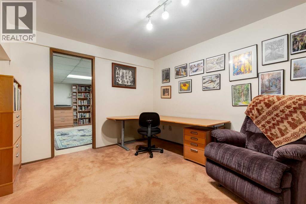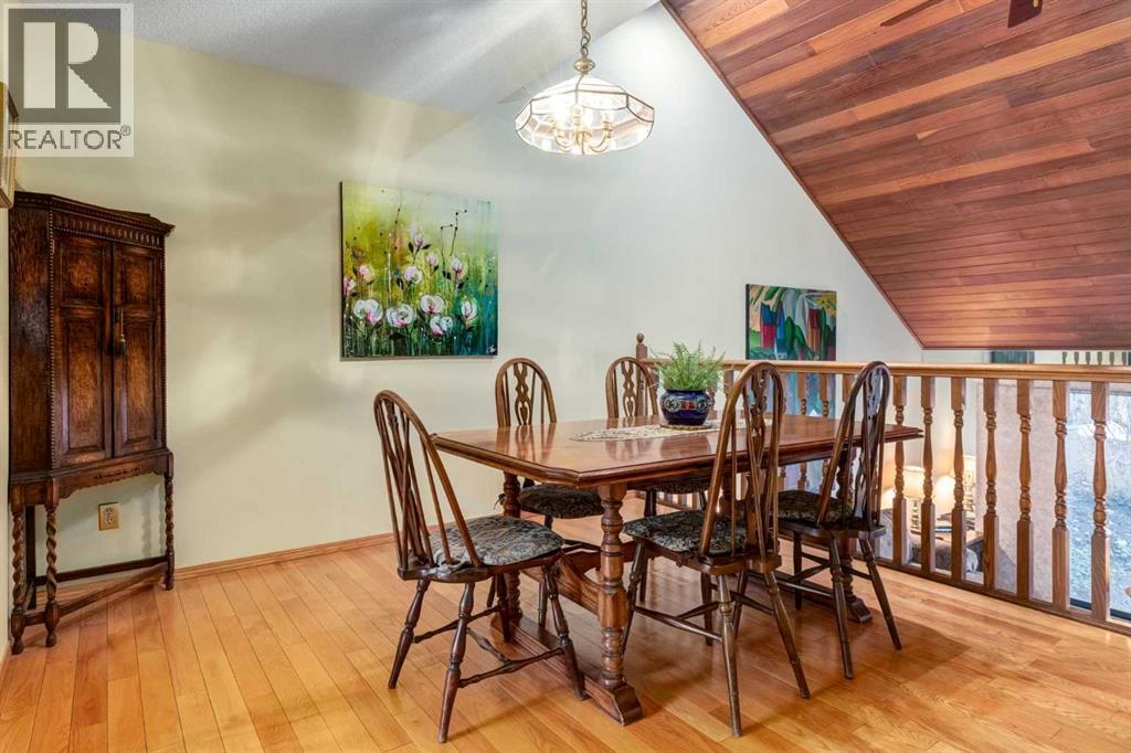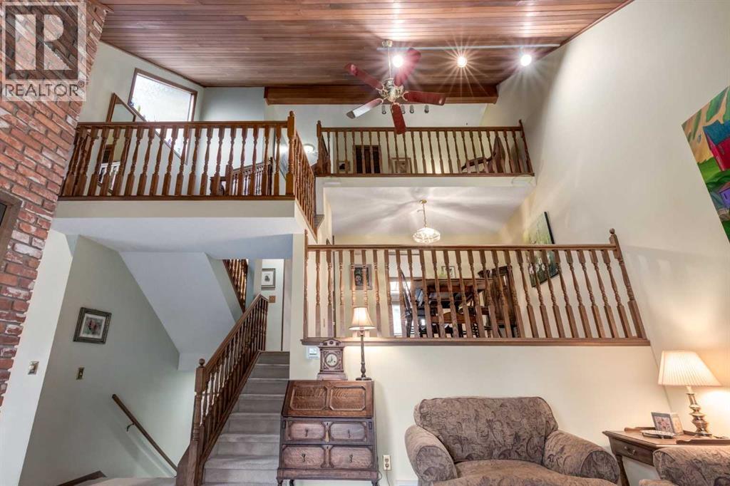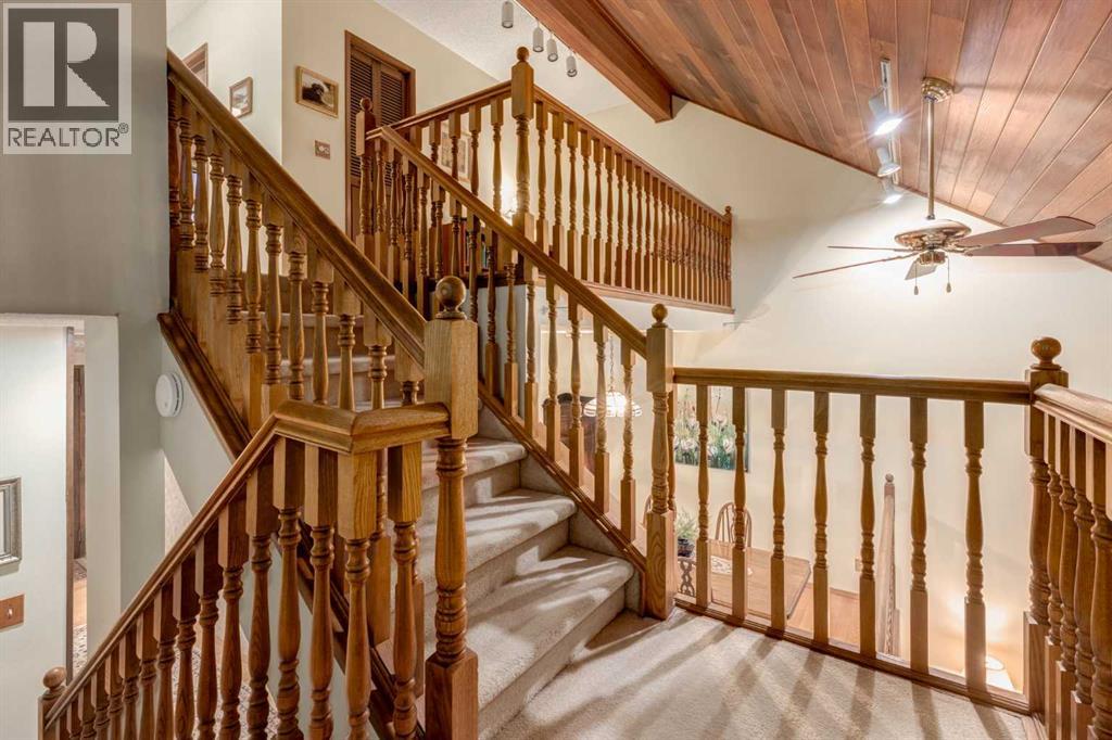 This mid-century modern townhome is an end unit next to a grove of mature trees and overlooking a park. The Bow River Pathway is just beyond the back yard and provides a direct, 15-minute walk to the river and all the surrounding amenities including off-leash dog parks, swimming areas and beaches. Built in 1972, this home is mostly original with the exception of a brand-new furnace and hot water tank, a three-year-old washer and dryer and newer stainless-steel appliances. As you enter this welcoming home, you are transported back in time to an era where quality and longevity were valued. Throughout the home you will find details that have become ‘too expensive’ to include in homes today such as solid wood, masonry and plywood subfloors. Renovations of properties from this era are incredible because the ‘bones’ are solid and the opportunity to incorporate original features adds a charm that cannot be replicated. A soaring vaulted ceiling clad in cedar tongue and grove boards runs up the East side of the home and houses a winding staircase lined with open spindle railing that showcases the multi-levels. A two-sided brick fireplace separates the family and living rooms and runs from floor to ceiling, following the sharp line of the vault. These amazing features are classic 1970s styling and look amazing incorporated into a renovation. A main entrance with a solid wood door featuring carved quatrefoil design panels and a charming brass letter box leads to a sunny kitchen with a breakfast nook. The formal dining room looks over the living room, and a private powder is located next to the double attached garage. A primary suite with an ensuite and a private balcony, a second bedroom, a full bathroom and an airy bonus room are located on the upper level. The basement is finished and offers an additional full bathroom, a cozy den and a flex room. A two-level deck is fully enclosed for maximum privacy and a safe place for pets and the mature trees and shrubs that adorn the yard blend seamlessly into the park and pathway beyond. (id:51913)