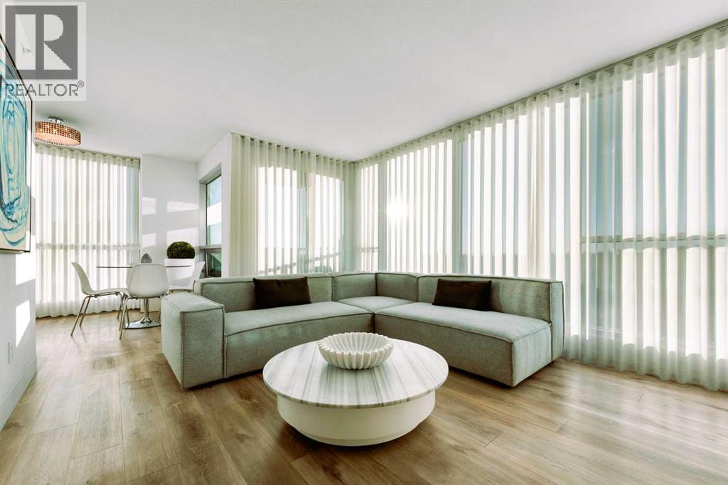 Spacious concrete 1 bedroom + large den (fits day / murphy bed) with approx. 40’ acoustic insulated floor to ceiling UV blocking glass for expansive south & east views over parks and cityscapes. Perfect pet-friendly central residence or pied-à-terre with low property taxes, low condo fees, and healthy reserve fund, just steps from Elbow River / parks, groceries, cafés, restaurants, bike paths, C-Train, buses, multiple entertainment / event destinations, plus many fitness and healthcare facilities / services.Premium Appliances: Frigidaire Professional Induction range, Blomberg Germany fridges and laundry, Fisher Paykel dishwasher drawer. Premium Fixtures: Blu Bathworks thermostatic bath / shower, Baril / Jalo faucets, 10MM tempered glass bath divider, minimalist luxury dimmer lighting throughout. High Quality Surface Finishes: cabinets, floors, doors, walls, bath ceiling (Japan, Austria, USA, Canada) for durable low maintenance luxury and high-quality indoor air quality (IAQ). Designer Details: colour coded wall fixtures, 3mm Aluminum base boards, plus VOC free black out blinds with opaque ripple fold sheers (remote control south face) for on demand control of light & view filtering for exceptional privacy and ambience.Custom closet / storage organization for optimal functionality and space utilization with >120 sq.ft. shelving & sliders plus 192’ available hangar length delivers ample four-season organization.One heated underground parking (84”H) long enough for large pick-ups and SUVs, or car + motorcycle plus bicycle with 110V plugs and double elevator steps away.Affordable central location and luxury serene living experience with quick possession available. (id:51913)