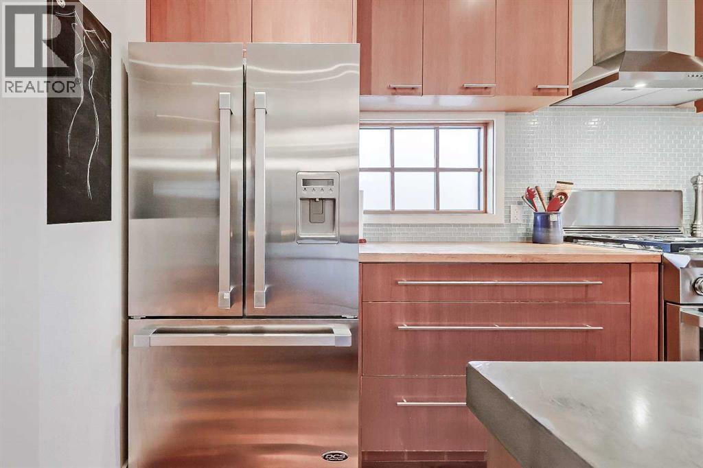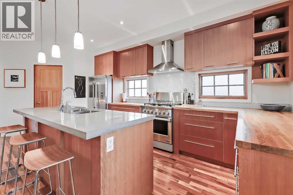 *Unbeatable Price for this quick possession dream home* Spend the holidays and ring in the new year in your new home!* Presenting CANMORE IN THE CITY: This stunning custom-built home in the heart of Parkdale is located ACROSS from GREENSPACE and offers a perfect blend of MODERN MOUNTAIN design and rare upgrades like an ATTACHED HEATED DOUBLE GARAGE and ICF CONCRETE PARTY WALL. This home was completely custom-built, with numerous unique, high-end features that you don't see in todays newly-built homes due to rising costs and supply challenges, like gorgeous ACACIA HARDWOOD flooring, SOLID FIR DOORS, an open riser SOLID WOOD AND GLASS STAIRCASE with SOLID TIMER supports (easily a $16,000+ upgrade at todays cost), and a stunning WOOD STUMP PEDESTAL in the powder room, handcrafted from one of the original trees on this homesite to bring a little history. Open and bright throughout, the main floor features an inviting living room with cozy gas fireplace, and rear kitchen and dining opening to the WEST-FACING upper deck with stained WOOD PERGOLA and railing. The upgraded chef’s kitchen impresses with a walk-in pantry, custom SITE-BUILT CABINETRY with birch drawers, sleek glass tile backsplash, and CONCRETE/BUTCHER BLOCK counters. Premium DCS PROFESSIONAL SERIES appliances by Fisher Paykal include a 5-burner gas range and dual drawer dishwasher. A large kitchen island offers bar seating for entertaining. Upstairs, 3 large bedrooms, 2 full baths, convenient laundry room, and HANDCRAFTED BARN DOOR features await. The generous primary suite has a walk-in closet, and a handcrafted barn door leading to a luxurious five-piece ensuite with DUAL SINKS, a FREESTANDING TUB, tiled glass STEAM SHOWER, and heated travertine tile floors. Fully developed lower level includes a recreation room with flex/gym space, 2-piece bath, and a tiled mudroom/foyer offering direct access to the HEATED ATTACHED DOUBLE GARAGE - an absolute dream in the cold winter months. Additional parking for 2 m ore vehicles can be found on the driveway, conveniently roughed in for a snow-melt system. Despite its mountain vibes, this home is perfectly located just minutes from the Bow River Pathway, the Foothills and Childrens Hospital, and downtown. Numerous transit options, the park pathway system, and quick access to main arteries make commuting to work and the mountains a breeze. VIEW MULTIMEDIA LINK FOR FULL DETAILS including FLOORPLANS & IMMERSIVE VIRTUAL TOUR! (id:51913)